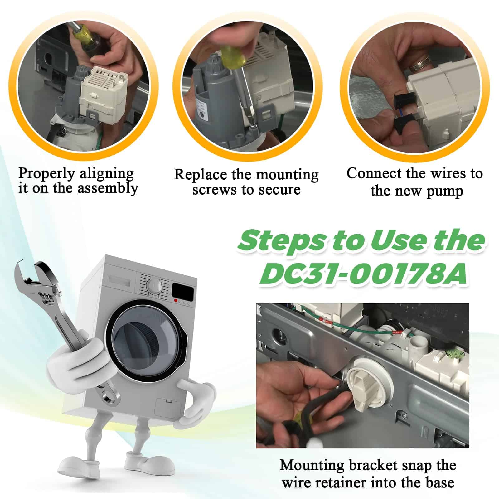 5. INSTALACIÓN PARA HACERLO TÚ MISMO: Desconecte la energía antes de instalar esta parte. La instalación necesita un destornillador de cabeza Phillips y alicates. Puede encontrar el video de reparación en YouTube y seguirlo para instalar la Bomba de Desagüe DC31-00054D, ya que había muchos videos de bricolaje que te ayudaban en la reparación. Retire la tapa de plástico del filtro de la bomba, luego retire los 2 tornillos en la parte trasera. Retire la manguera del conjunto de la bomba de desagüe y extráigala por la parte inferior de la lavadora (ten cuidado de no cortar el cable). Fácil de instalar, solo recuerda qué conector se enchufa en qué terminal.