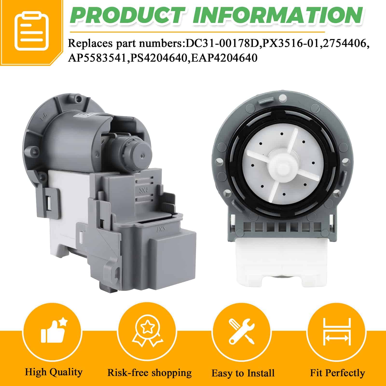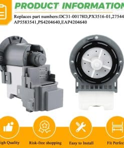 2. CONTENIDO DEL PAQUETE: 1 x Motor de bomba de desagüe para lavadora Samsung DC31-00054D (OEM). Está hecho de materiales duraderos de alta calidad que previenen la rotura y el fallo durante el proceso de instalación y uso. La bomba de desagüe samsung px3516-01 está lubrificada adecuadamente con aceite de alta calidad para asegurar que la bomba funcione de manera silenciosa y suave. Actualice los materiales metálicos para evitar la oxidación y aumentar la vida útil de la bomba de drenaje px3516-01 de Samsung. Puede reemplazar la bomba de desagüe Samsung PX3516-01 para solucionar los siguientes problemas de su lavadora: ruido, no drena, no gira, pierde agua, la ropa está más húmeda de lo habitual, la lavadora daba un código de error 5E, SE o Sud.