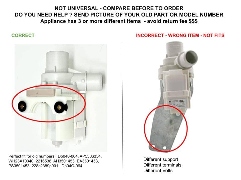 Motor de Bomba de Desagüe de Agua para Lavadora Antiguo s 228C2389P001, DP040-064, Motor de Bomba de Desagüe de Agua para Lavadora WH23X10040, B0093RKS9E, 52140000 números antiguos WH23X10040 AP5306354 2216538, AH3501453, EA3501453, PS3501453 nuevo número es ajuste perfecto 120 V y 75W, 80W, 85w NO OEM, ajuste perfecto para series antiguas y nuevas INSTALACIÓN FÁCIL Conectores de cable iguales, No se requiere cable adicional Anillo de goma incluido, No necesita pegamento o sellador – Evita las fugas de agua No se requieren tornillos adicionales Mismo soporte Trabajo fácil – Sin fugas de agua Ajuste perfecto para series antiguas y nuevas