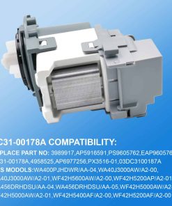 DC31-00178A es una bomba de drenaje para lavadora, utilizada para AC120V-60Hz, 80W. El motor de la bomba de drenaje DC31-00178A elimina el agua de la lavadora en la parte de drenaje del ciclo. El motor de la bomba de drenaje DC31-00178A para lavadora es una pieza OEM genuina. La etiqueta genuina garantiza que el diseño de las piezas cumple con las especificaciones de Samsung, proporcionando así el mayor rendimiento con la más alta calidad. Corrige los síntomas: 1. Lavadora hace ruido; 2. La lavadora no drena; 3. La bomba de la lavadora no gira; 4. La lavadora gotea; 5. Las prendas están más mojadas de lo habitual. Compatibilidad con modelos como WA40J3000AW/AA-13, WA456DRHDSU/AA-04, WA45H7000AW/A2-00, WA45H7200AW/A2-03, WA48J7770AW/AA, WA45M7050AW/A4-03, WA50K8600AW/A2-00 y más.