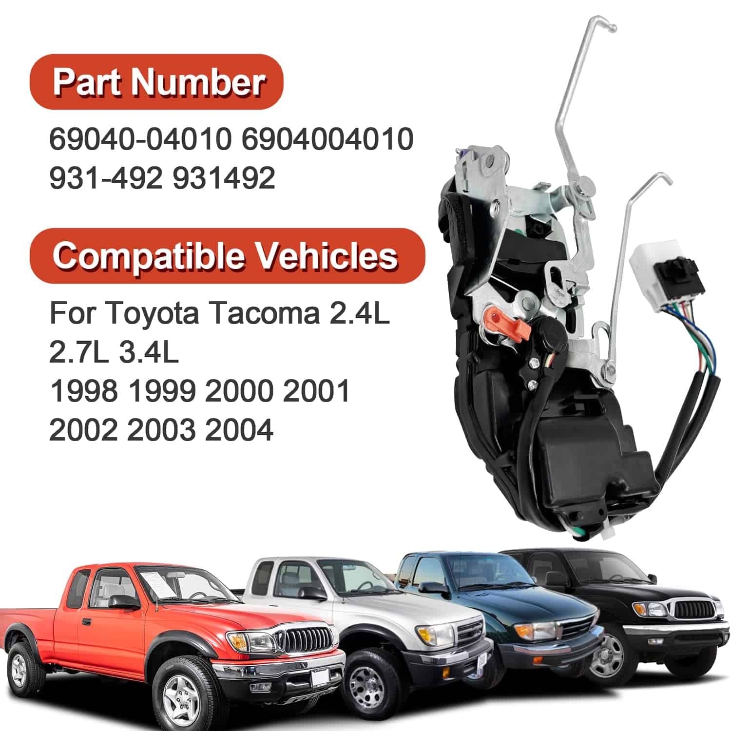 1x Motor del actuador de cierre de la puerta delantera izquierda integrado con cerrojo para Toyota Tacoma. Número de parte: 69040-04010 / 6904004010 / 931492 / 931-492. Compatible con los siguientes años y modelos: Para Toyota Tacoma 2.4L 2.7L 3.4L 1998 1999 2000 2001 2002 2003 2004. Garantía de 1 año y reemplazo gratuito.
