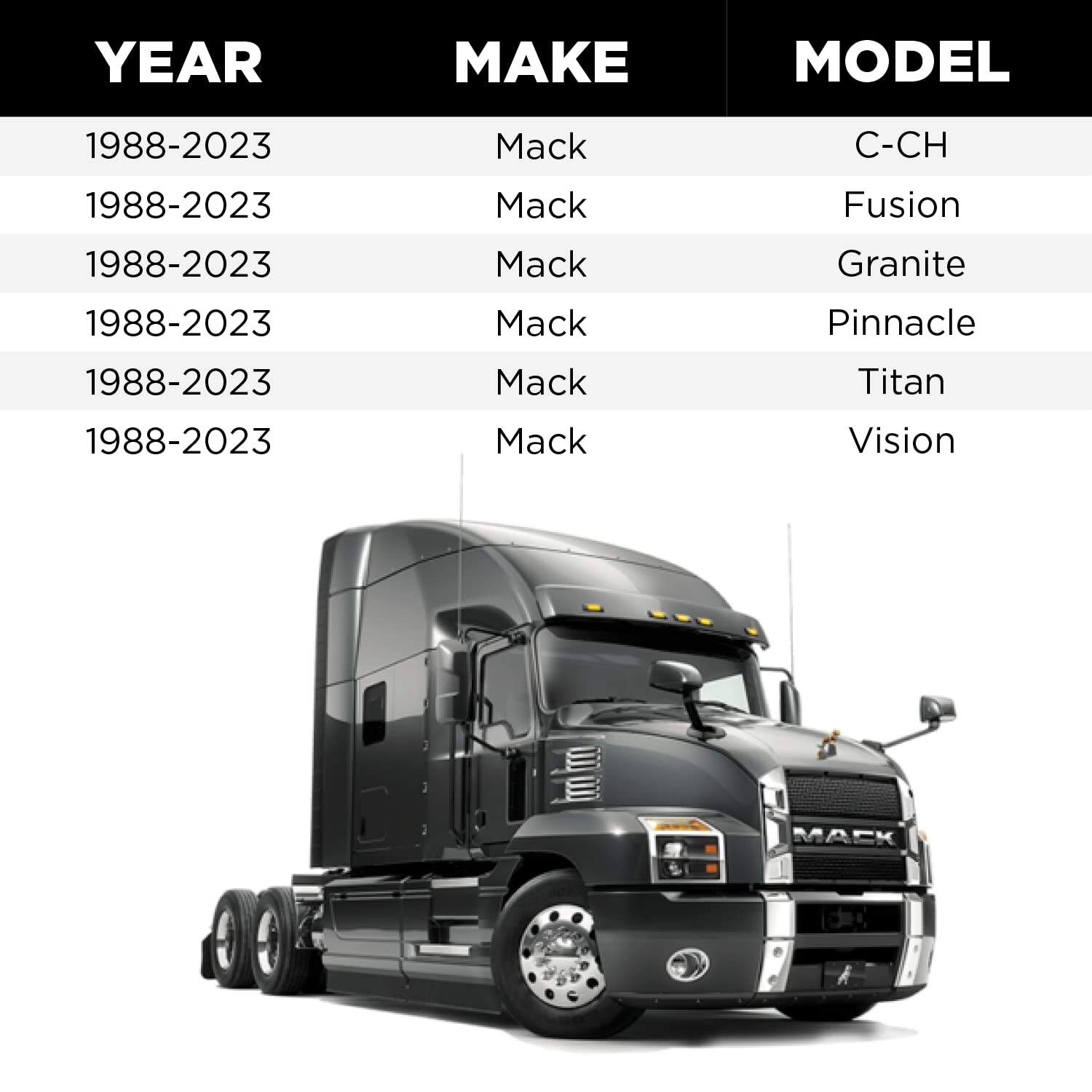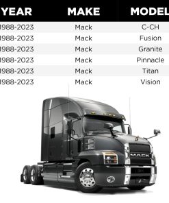 Se ajusta a los modelos Mack C, CH, LE y RD. Cruza con los motores Mack 63QT521 y 63QT310. Cruza con los motores E-008-223 y E-008-230. Se adapta a los modelos Kenworth C500, T300, T400, T450, T600, T800 y W900 (1987-2006). Cruza con United Technologies 1999-3110021.