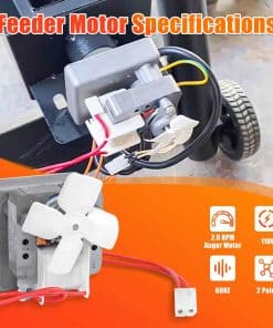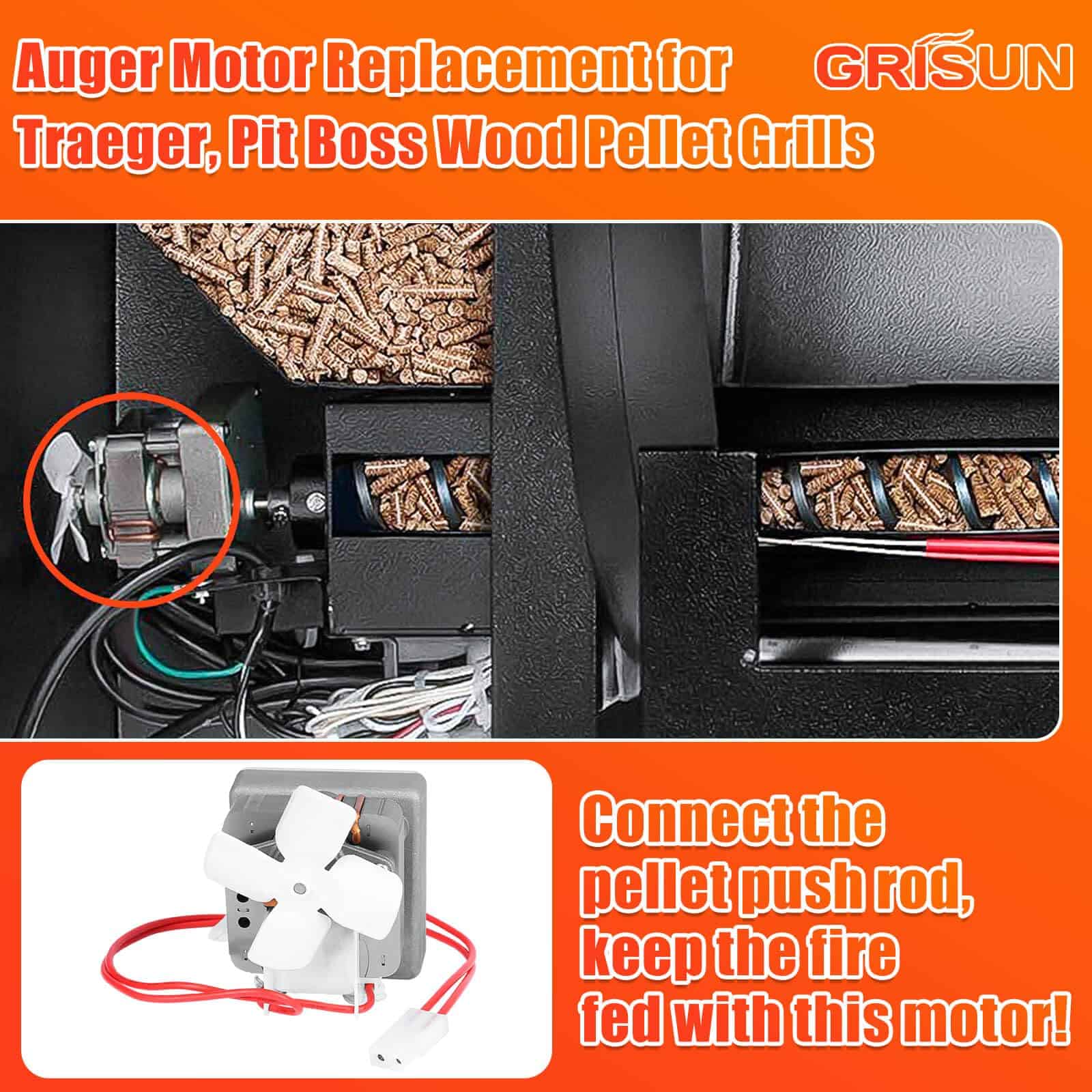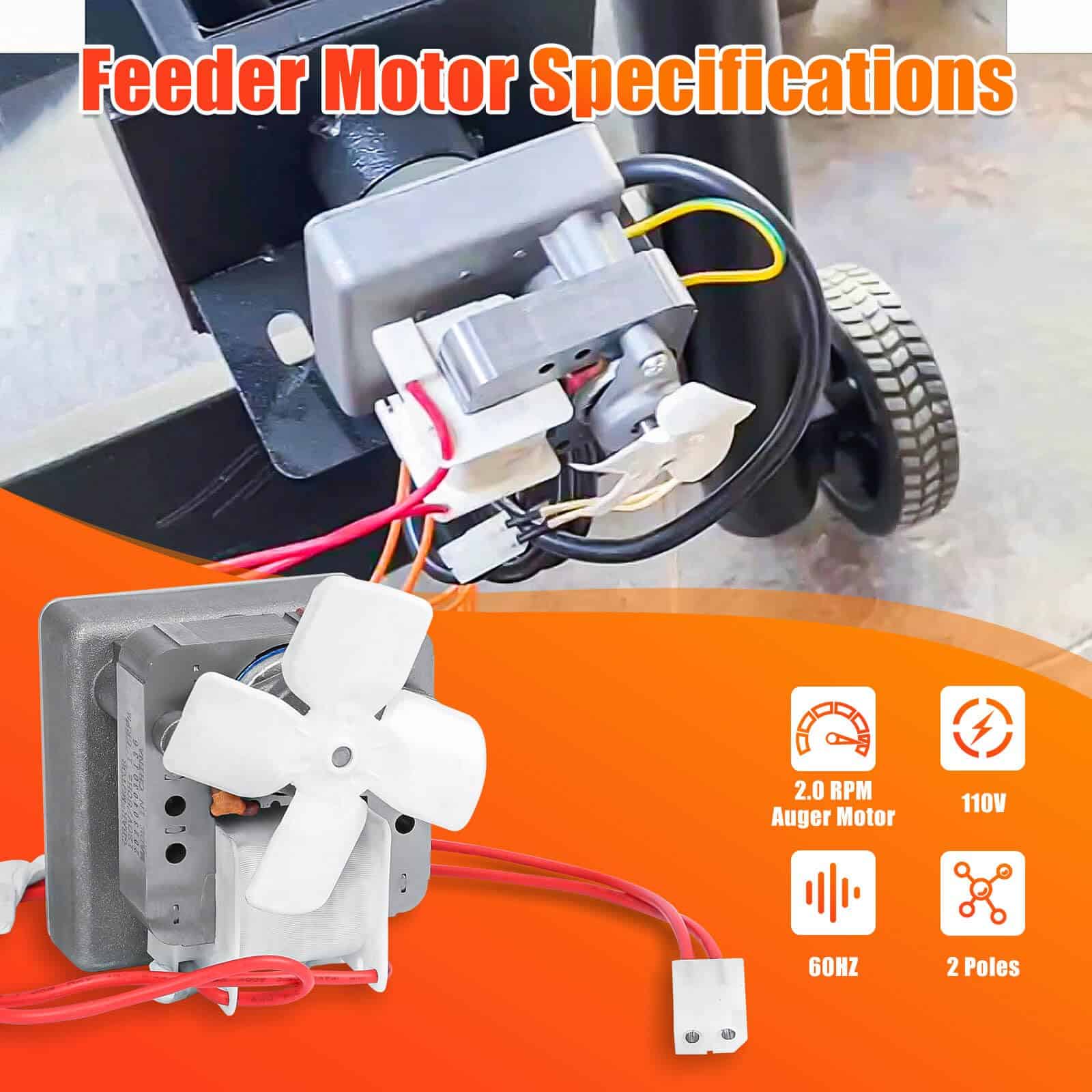 Direct Fit for Original. – El motor del sinfín se ajusta a los modelos de parrillas Traeger 070, 075, serie Texas Elite, Pro 22, Pro 34, serie Lil Tex Elite, parrilla de ahumador Camp Chef, parrillas de pellets de madera Pit Boss (EXCEPTO PTG). Característica del motor del sinfín – 2.0 RPM, 110V 60Hz 2 Polos; viene con un pasador del sinfín para modelos múltiples. La función principal de este motor del sinfín es generar energía para empujar pellets hacia la olla de fuego. Motor del sinfín actualizado – Actualice el cable del motor del sinfín, cable especial de alta tensión y resistencia a altas temperaturas UL1332/18AWG PEP Material. Haga que el motor del sinfín sea más duradero y más resistente a altas temperaturas. Fácil de conectar – Retire el contenedor de alimentos, retire el motor quemado o descuidado e instálelo como estaba. Mantener el tubo de alimentación – Limpie su tubo del sinfín. Sople con aire comprimido desde el extremo de la olla de fuego, mientras el contenedor de alimentos está vacío. Esto evitará obstrucciones de serrín que dañen los motores del sinfín. Cuándo reemplazar un motor del sinfín – Un motor del sinfín para parrillas de pellets mantiene el combustible en movimiento hacia la olla de fuego. Cuando sus pellets de madera dura no se alimenten hacia el fuego, por favor reemplácelo. Carga del sinfín – Tendrá que recargar el sinfín. Agregue una pequeña cantidad de pellets al contenedor de alimentos y tire una gran cantidad sobre el encendedor en la olla de fuego. el fuego debería encenderse, los tubos del sinfín más largos tardan un tiempo en cargarse. El controlador dejará de alimentar pellets después de cinco minutos si el fuego no se enciende. Así que apagar y volver a encender para fumar restablecerá la secuencia del encendedor. Cuando el sinfín esté cargado, verá caer pellets en la olla de fuego.