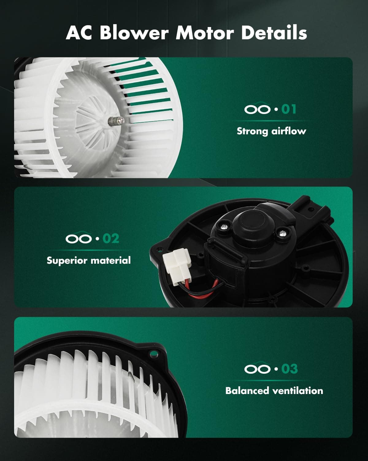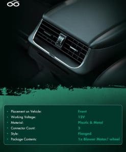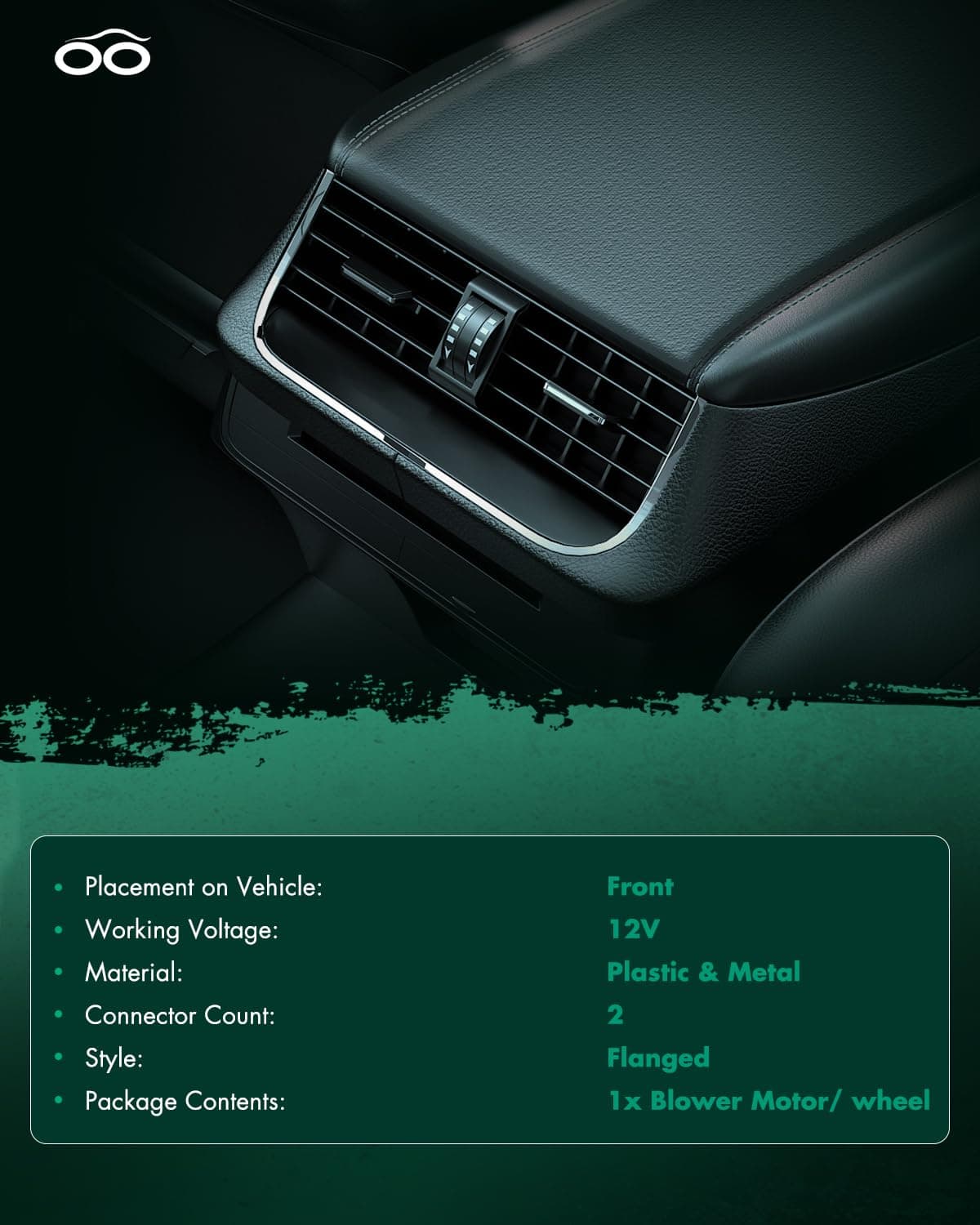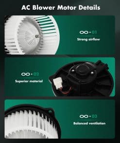 2. Especificaciones del producto: 1x Motor del soplador de aire acondicionado delantero con jaula de ventilador – Ubicación en el vehículo: Delantero; Estilo: Bridado; Ventilado: Ventilado; Material: Plástico; Número de Terminales: 2; Tipo de Terminales: 2 Conectores; Voltaje de Trabajo: 12V; Rueda de la Jaula incluida: con Rueda.