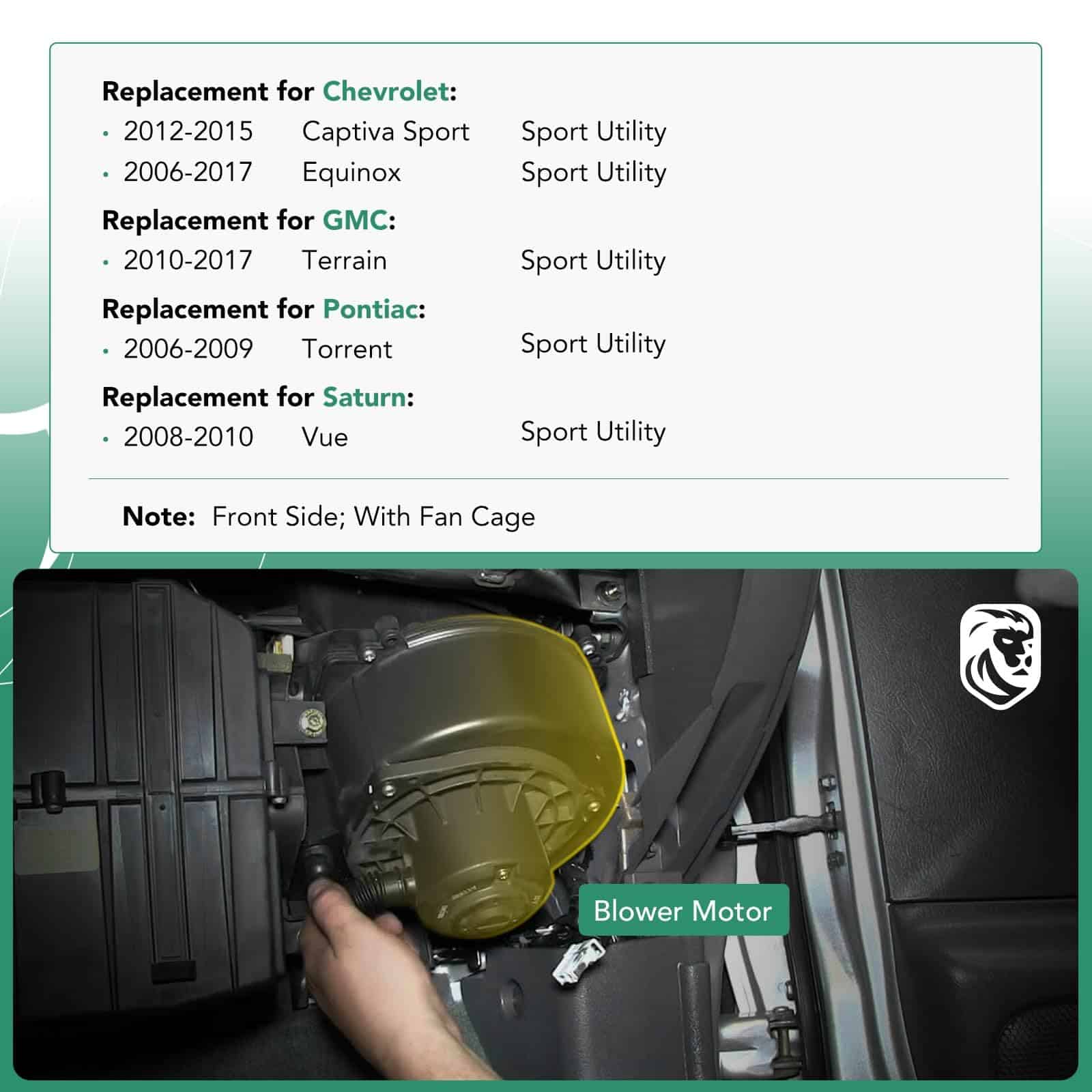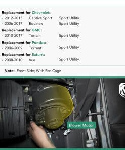 Este Motor del soplador del A/C con ensamblaje de la jaula del ventilador es una opción de repuesto confiable para vehículos Chevrolet Equinox 2006-2016, Captiva Sport 2012-2015, GMC Terrain 2010-2016, Pontiac Torrent 2006-2009, Saturn Vue 2008-2010. Fabricado por YHTAUTO, garantiza un ajuste directo y de calidad. Con una garantía de un año, puede confiar en la durabilidad de este motor del soplador para mantener su vehículo funcionando eficientemente.