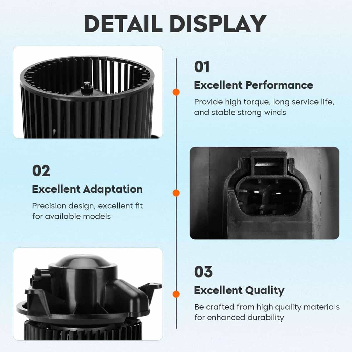 Motor del soplador HVAC con jaula de ventilador para Infiniti QX56 2004-2010, Nissan Armada 2005-2015, Nissan Titan 2004-2015. 700174, 27226ZH00A, 27226-ZH00A, 35076, 75883, NI3127107, PM9240. El motor del soplador HVAC con ventilador es responsable de producir aire que circula por las rejillas del sistema de aire acondicionado y calefacción de su vehículo. Si su aire acondicionado o calefacción no produce o circula aire caliente o frío, es posible que tenga un problema con su motor del soplador. Nuestro motor del soplador HVAC está hecho de material de alta calidad que es confiable y duradero. Se somete a rigurosas pruebas mecánicas y eléctricas, garantizando el uso fuerte y duradero del motor. Garantía de calidad de 1 año. No dude en enviarnos un correo electrónico si tiene alguna duda o consulta.