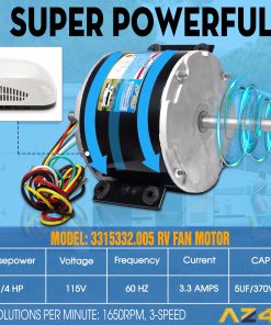 El motor del ventilador 3315332.005 es un motor de ventilador de repuesto para el motor del ventilador Genteq F48AF70A61 y para el motor del ventilador Brisk Air 2 de Dometic. Este motor del ventilador de aire acondicionado alimenta el ventilador y la rueda del ventilador que mueve el aire a través del sistema de aire acondicionado del RV. El motor del aire acondicionado de RV es responsable de generar la fuerza requerida para mover el aire a través del sistema de aire acondicionado. Este motor de aire acondicionado de RV de repuesto está diseñado para funcionar a altas velocidades durante períodos prolongados de tiempo y está construido para soportar las duras condiciones del viaje en RV. Es un motor de polo sombreado que funciona creando un campo magnético giratorio utilizando una fuente de alimentación de CA. Esto resulta en un bajo ruido, alta fiabilidad y bajo mantenimiento.