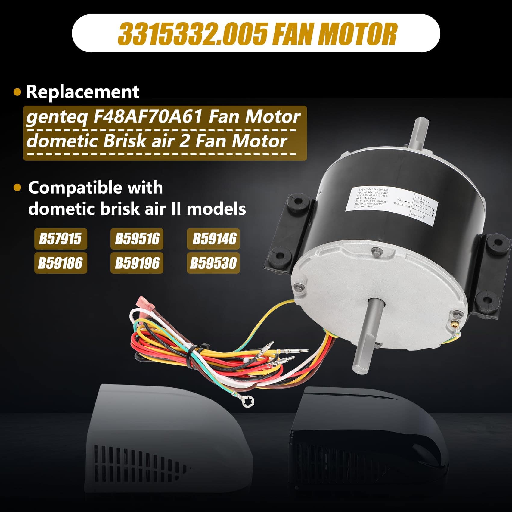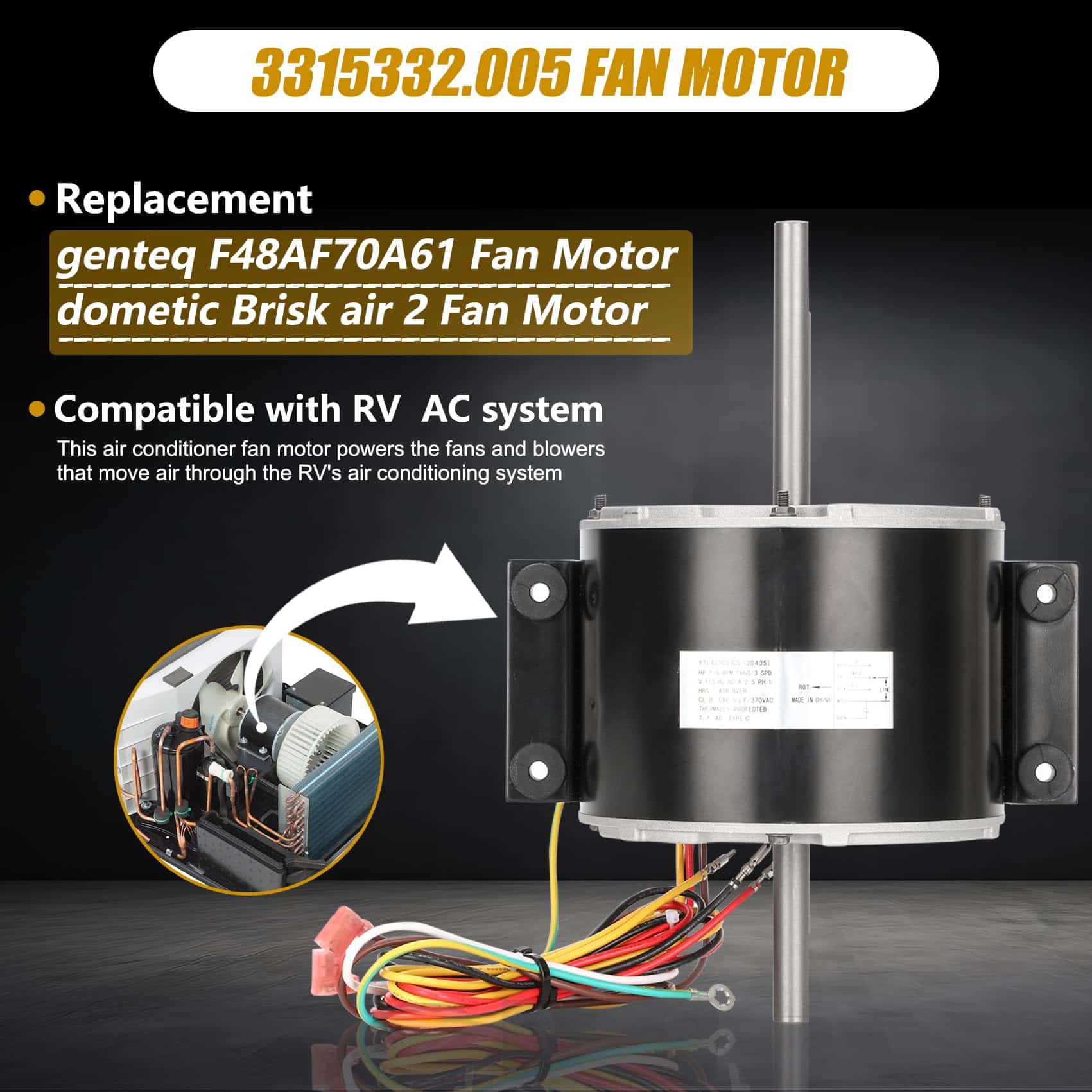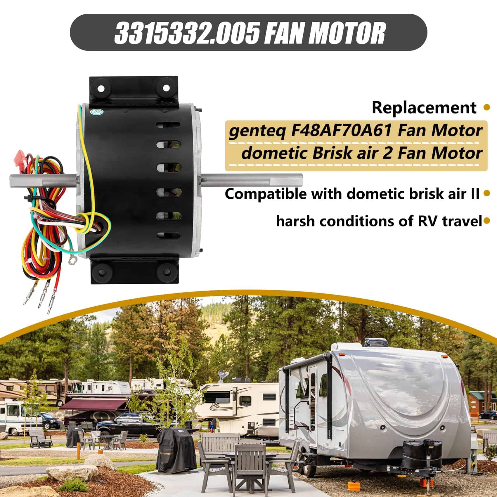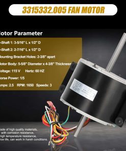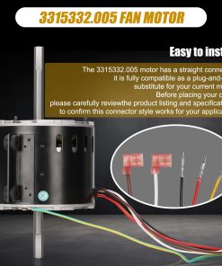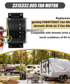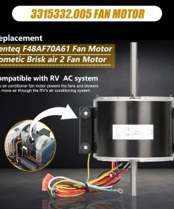 Part Number 3315332.005 fan motor replacement genteq f48af70a61/dometic brisk air 2 fan motor.This air conditioner fan motor powers the fans and blowers that move air through the RV’s air conditioning system. Made of high quality materials, with corrosion resistance, high temperature resistance, long service life, can work in harsh conditions. Compatible RV Models 3315332.005 fan motor can replacement dometic brisk air 2 fan motor/genteq f48af70a61 fan motor. This motor compatible with dometic brisk air II models: B57915/B59516/B59146/B59186/B59196. Specification D-Shaft 1: 3-5/16″ L x 1/2″ D, D-Shaft 2: 2-7/16″ L x 1/2″ D, Mounting Bracket Holes: 2-3/8″ apart, Motor Body: 5-5/8″ Diameter x 4-3/8″ Thickness, Voltage: 115 V, Hertz: 60 HZ, Amps: 2.5, Horse, Power: 1/5, RPM: 1650, Speeds: 3. High Quality & Energy Saving The f48af70a61 fan motor has a straight connector, it is fully compatible as a plug-and-play substitute for your current model. Before placing your order, please carefully review the product listing and specifications to confirm this connector style works for your application.