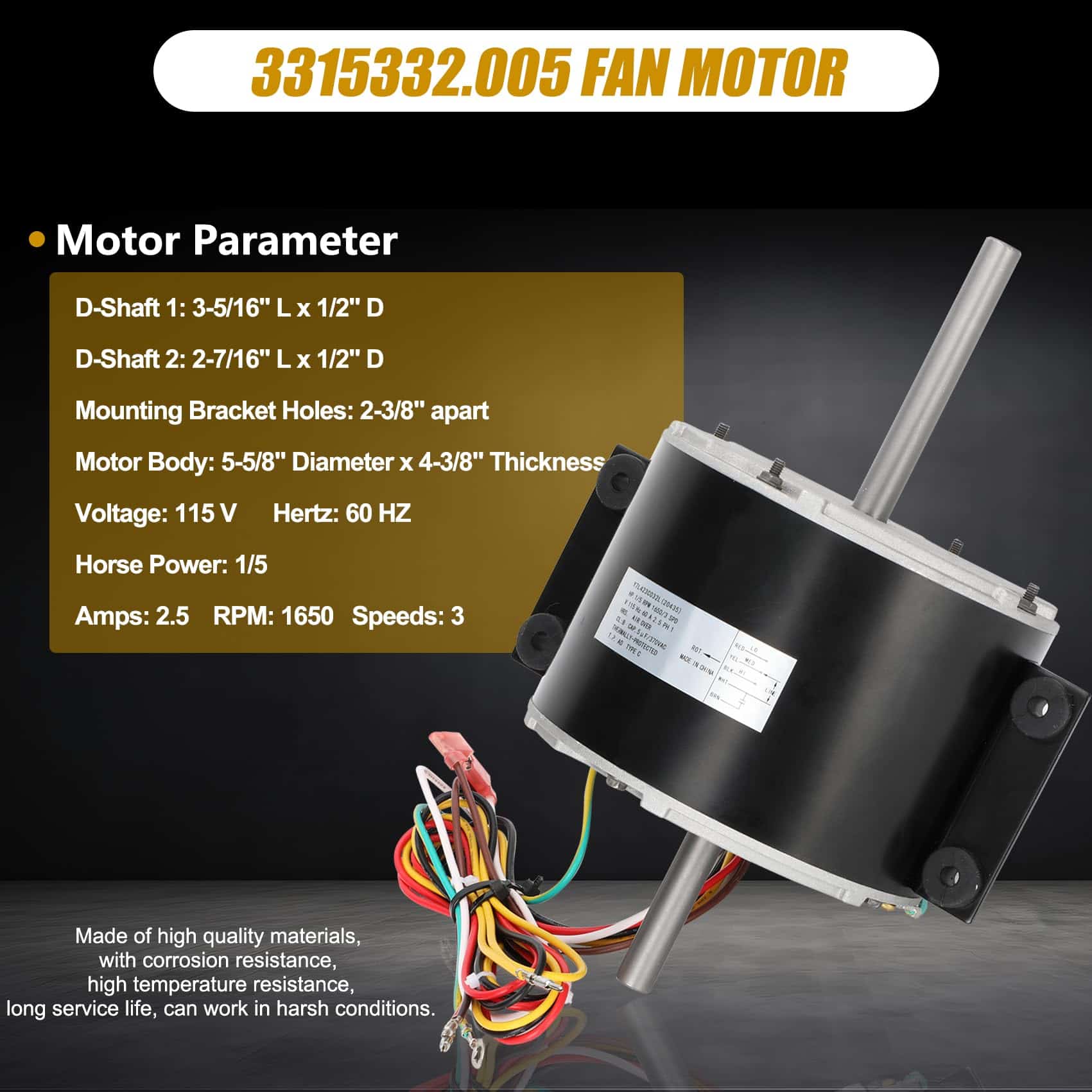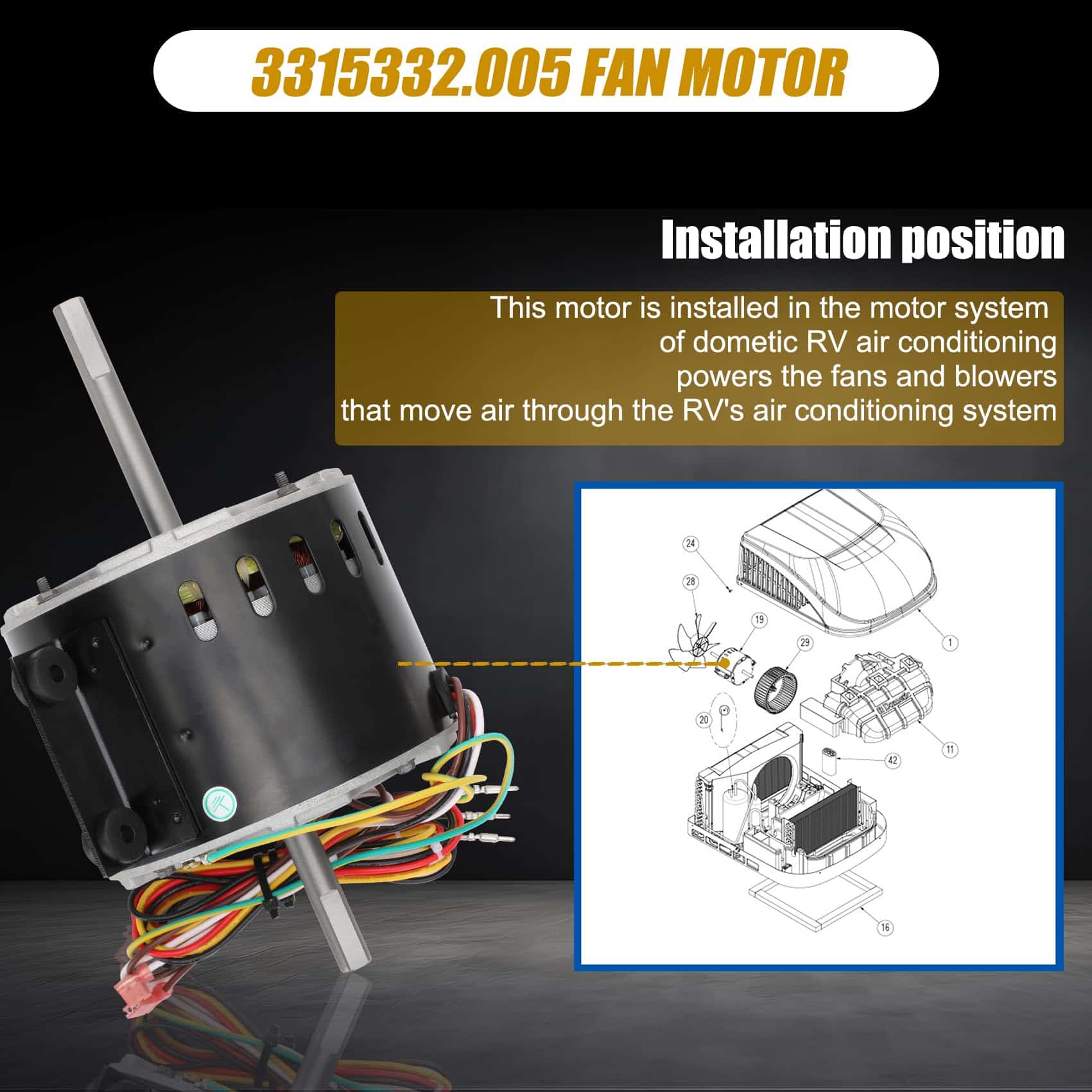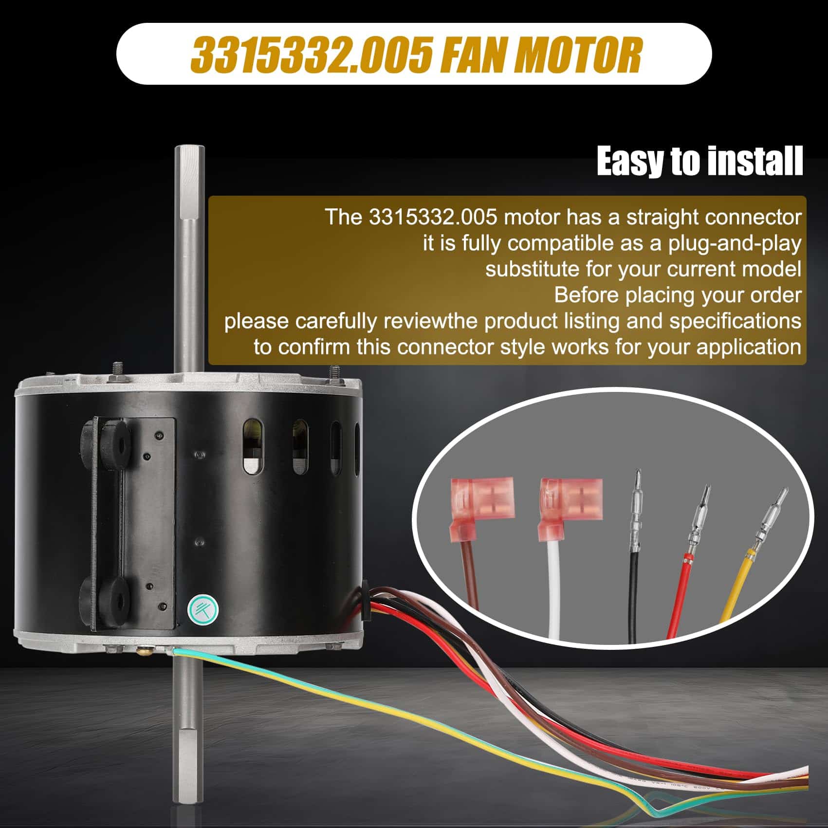 Part Number 3315332.005 fan motor replacement genteq f48af70a61/dometic brisk air 2 fan motor.This air conditioner fan motor powers the fans and blowers that move air through the RV’s air conditioning system. Made of high quality materials, with corrosion resistance, high temperature resistance, long service life, can work in harsh conditions. Compatible RV Models 3315332.005 fan motor can replacement dometic brisk air 2 fan motor/genteq f48af70a61 fan motor. This motor compatible with dometic brisk air II models: B57915/B59516/B59146/B59186/B59196. Specification D-Shaft 1: 3-5/16″ L x 1/2″ D, D-Shaft 2: 2-7/16″ L x 1/2″ D, Mounting Bracket Holes: 2-3/8″ apart, Motor Body: 5-5/8″ Diameter x 4-3/8″ Thickness, Voltage: 115 V, Hertz: 60 HZ, Amps: 2.5, Horse, Power: 1/5, RPM: 1650, Speeds: 3. High Quality & Energy Saving The f48af70a61 fan motor has a straight connector, it is fully compatible as a plug-and-play substitute for your current model. Before placing your order, please carefully review the product listing and specifications to confirm this connector style works for your application.
