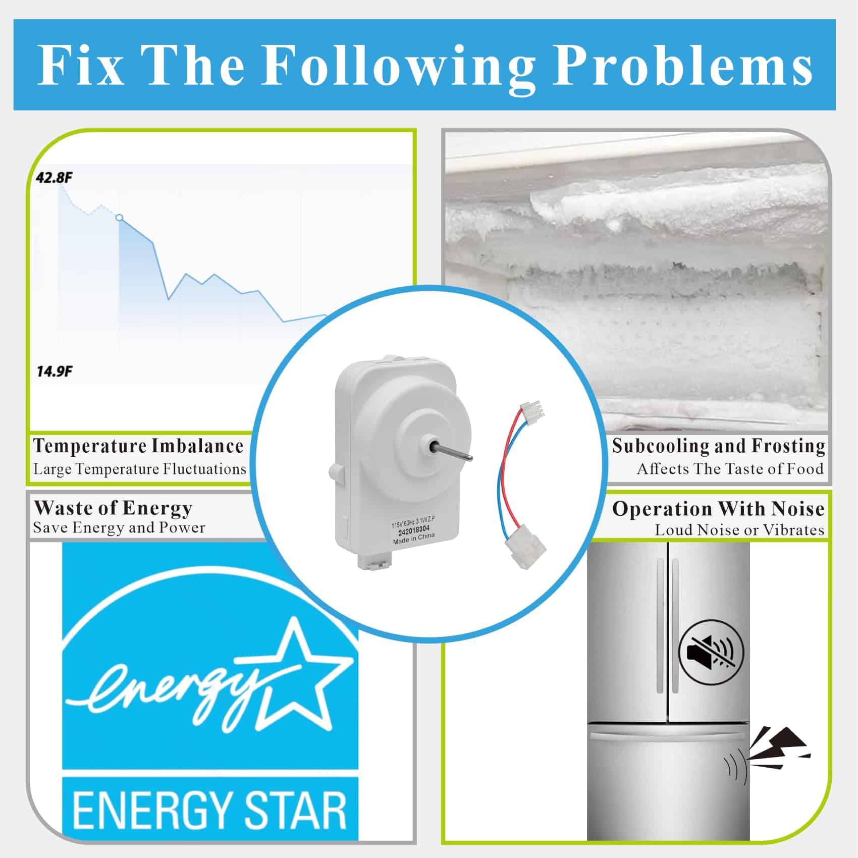 El motor del ventilador del condensador del refrigerador 242018301 242018304 está hecho de ABS de alta calidad. Rendimiento sobresaliente para brindarte una mejor experiencia de uso.