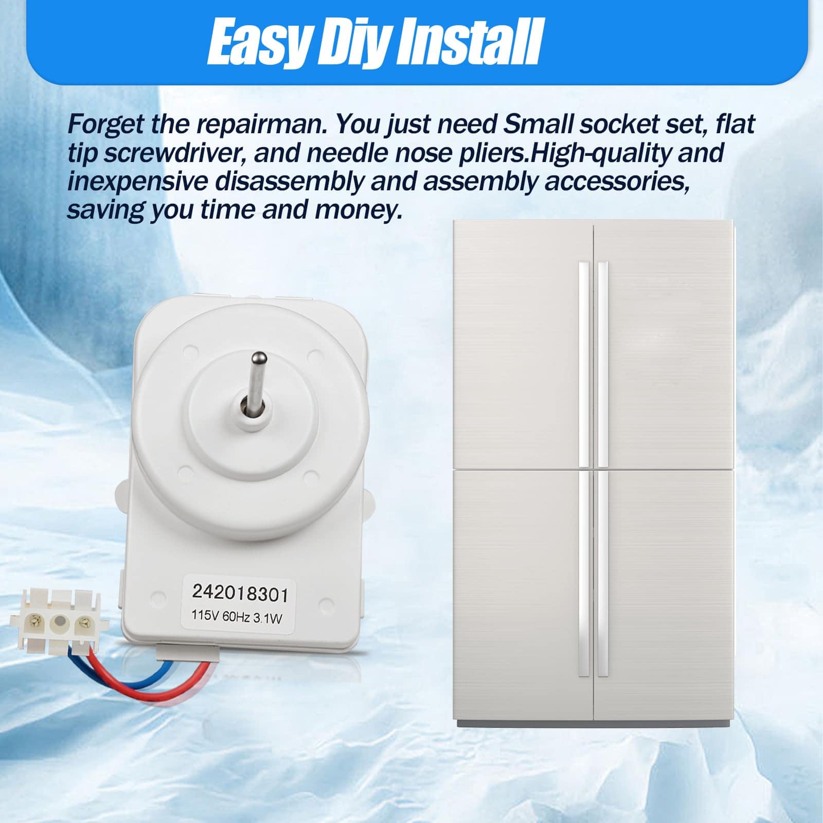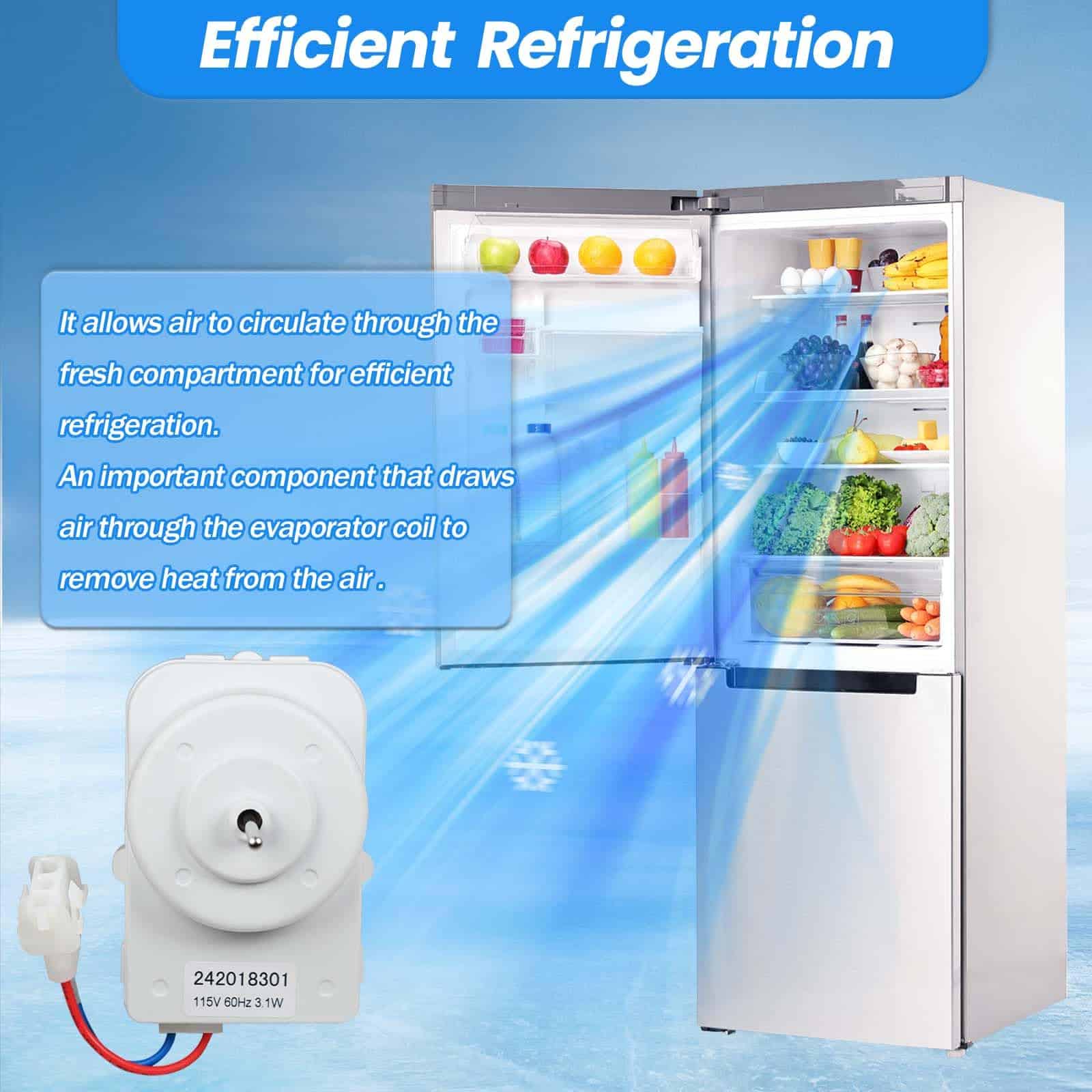 2. Especificaciones y Materiales : Clasificado 115V, 60Hz, 3.1 Watts. La carcasa del motor del ventilador del refrigerador está hecha de materiales plásticos ABS de alta calidad y el interior está hecho de metal de alta calidad. Esta durabilidad garantiza una larga vida útil y reduce la necesidad de reemplazos frecuentes.