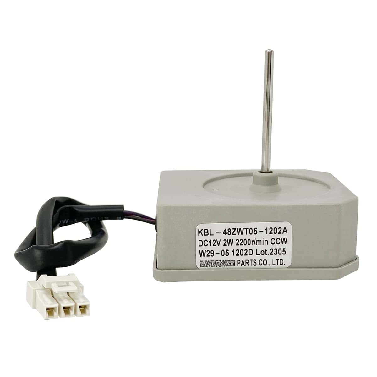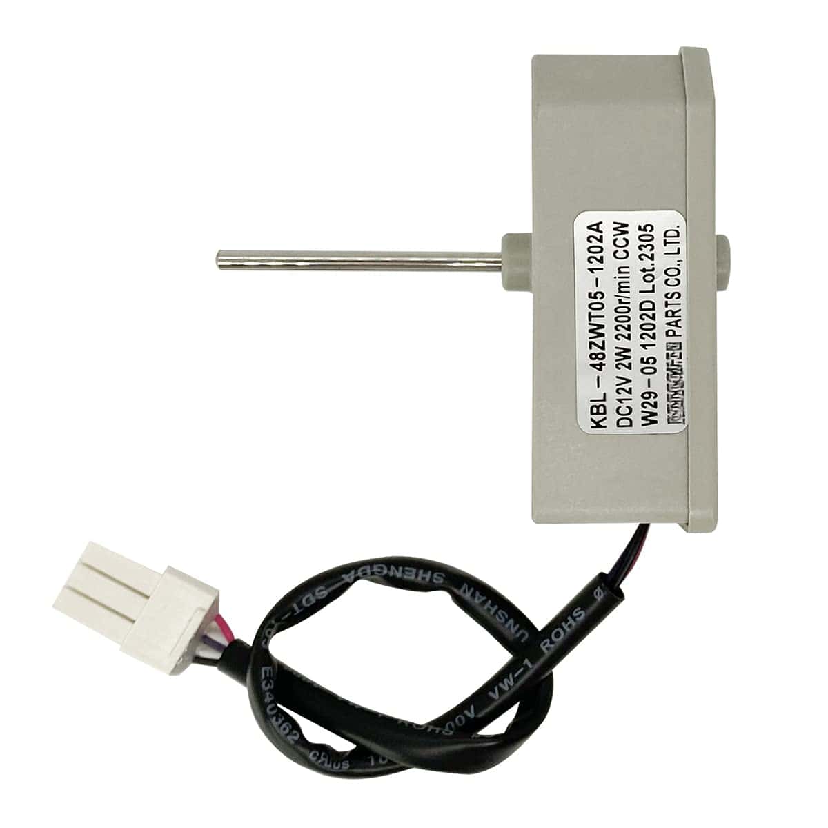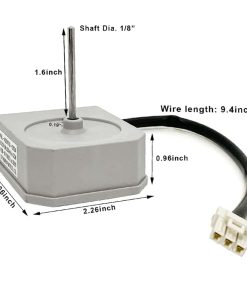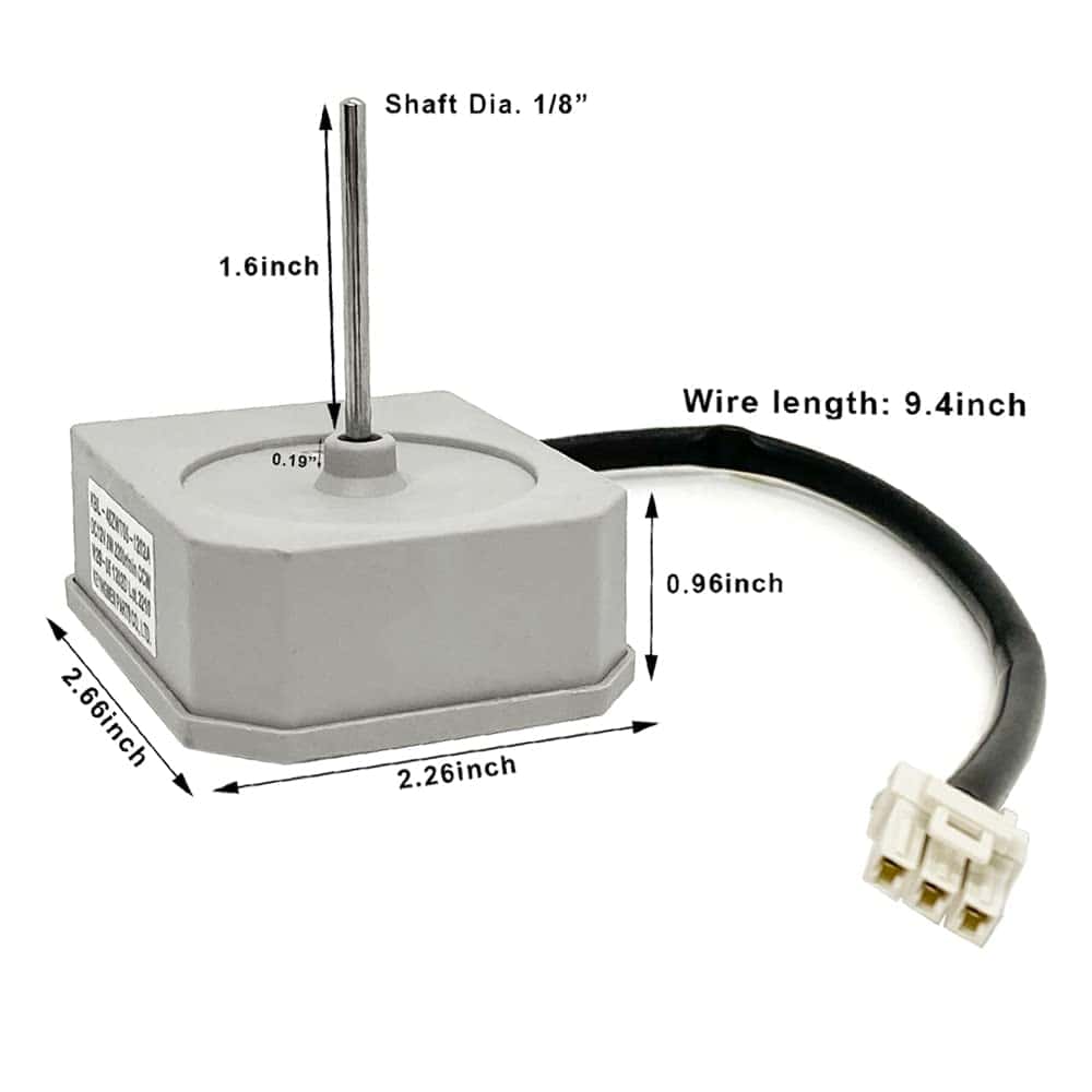 Especificaciones: Marca: JFQWLE Modelo: KBL-48ZWT05-1202A Voltaje: DC12V Potencia: 2W Velocidad: 2200r/min Rotación: CCW Pines: 3 Tamaño del motor: 2.66×2.26×2.95 pulgadas Longitud del eje del motor: 1.6″ Diámetro del eje del motor: 1/8″ Longitud del cable: 9.6″ Compatible con Frigidaire, Magic Chef, Omar, Refrigeradores TCL algunos modelos (no todos), por ejemplo Frigidaire(FFET1222UW FFET1222UB FFET1222UV FFET1022UV FFET1022UB FFET1222UW), Magic Chef(HMDR1000BE HMDR1000WE HMDR1000ST); Por defecto, el ventilador de 4 hojas también es compatible con muchos otros motores de ventilador de marcas famosas (diámetro del eje de 0.12~1/8 pulgadas). Paquete incluido: 1x Motor de repuesto para refrigerador