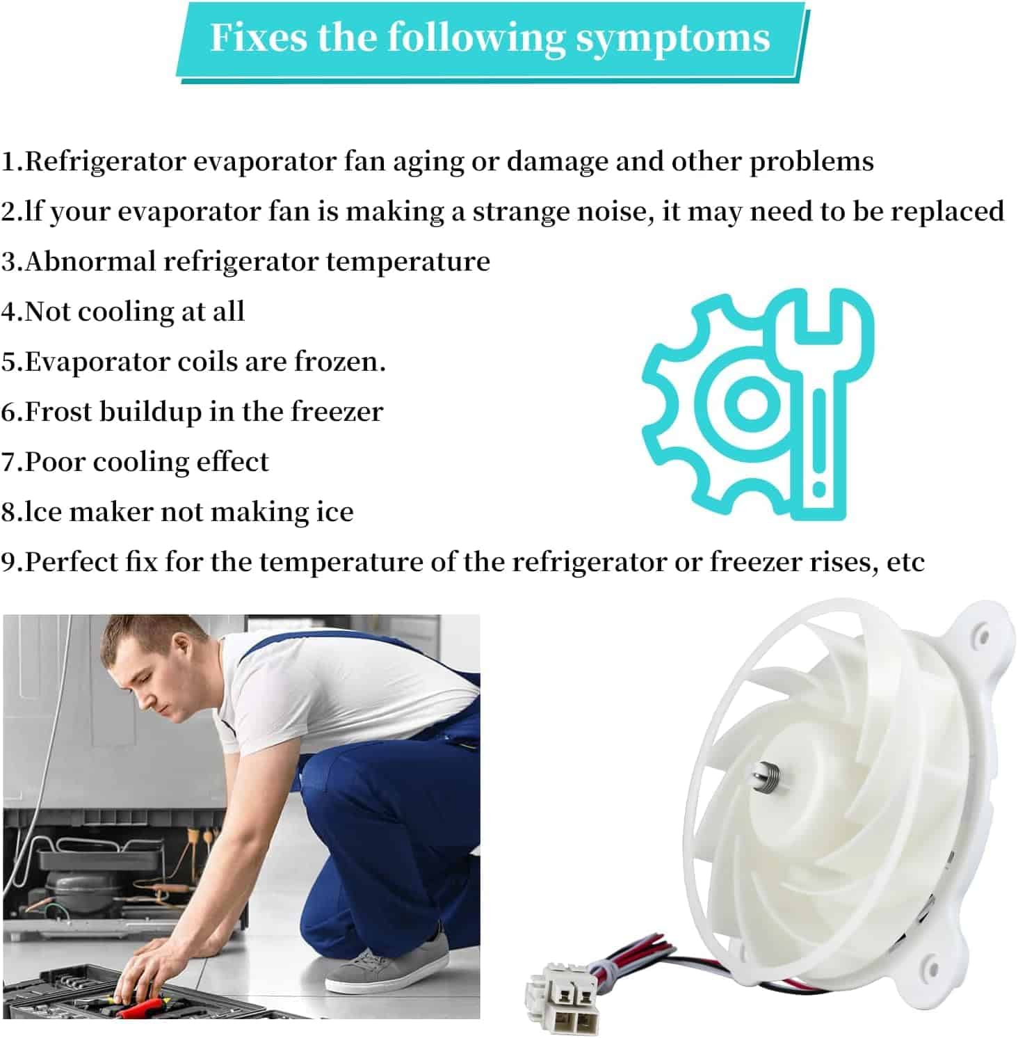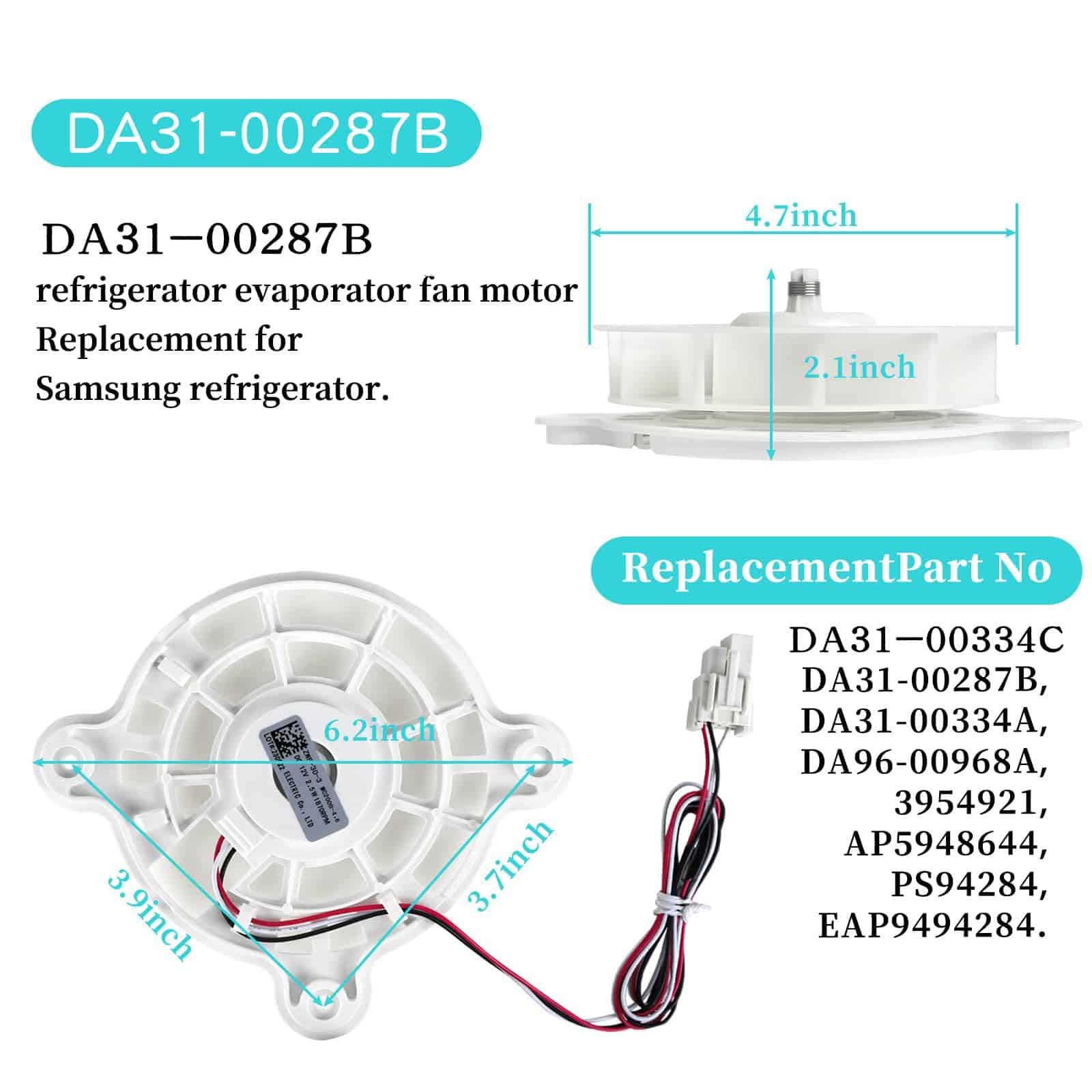 Reemplace el número de parte compatible con el refrigerador Samsung reemplaza DA31-00334C, DA31-00334A, DA96-00968A, AP6803162, 3954921, AP5948644, PS9494284, EAP9494284, etc. DC 12V, 0.12A, 2.5W, 1870rpm.