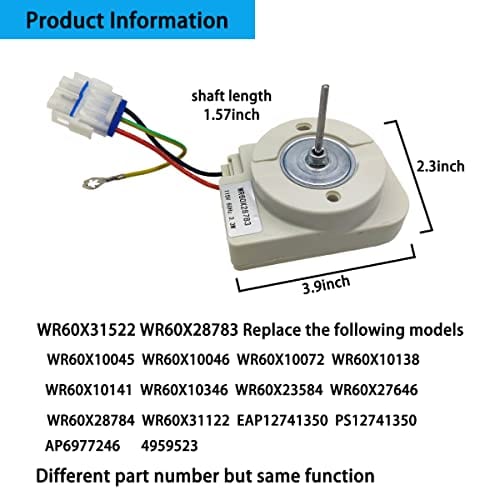 Motor del ventilador evaporador de refrigerador mejorado WR60X31522 WR60X28783 PS12741350, compatible con GE Hotpoint, reemplaza AP6977246 Wr60x23584 WR60X28784 WR60X31122 Wr60x10046 4959523, 10 años de garantía. Fabricante profesional: La calidad del producto y la satisfacción del cliente son nuestros objetivos en la fabricación y suministro de productos. Es nuestra responsabilidad proporcionarle motores de ventilador de refrigerador WR60X31522 de alta calidad. Solución de instalación simple y rápida: La instalación del motor del ventilador del refrigerador WR60X31522 es muy sencilla, simplemente retire e instale un nuevo motor. Después de la sustitución, se pueden resolver los problemas de temperatura anormal y ruido del refrigerador. Información del producto: El motor del ventilador WR60X31522 WR60X28783 puede reemplazar los siguientes modelos de motores: WR60X10045 WR60X10046 WR60X10072 WR60X10138 WR60X10141 WR60X10346 WR60X23584 WR60X27646 WR60X28784 WR60X31122 EAP12741350 PS12741350 AP6977246 4959523. Los diferentes números de pieza pueden parecer diferentes pero funcionan igual. Modelos de refrigeradores compatibles: La figura 6 muestra los modelos de refrigeradores compatibles con el motor del ventilador evaporador WR60X31522. Solo algunos modelos, no todos. Al mismo tiempo, puede informarnos sobre el modelo de su refrigerador y le ayudaremos a confirmarlo. Este es el camino más rápido y eficiente. Servicio de calidad: Lo que compras no es solo el producto, sino también nuestro servicio. Asegúrate de contactarnos cuando no estés satisfecho o tengas problemas de uso. Te proporcionaremos una solución satisfactoria y efectiva en un plazo de 12 horas. Te permitiremos tener una experiencia de compra agradable.
