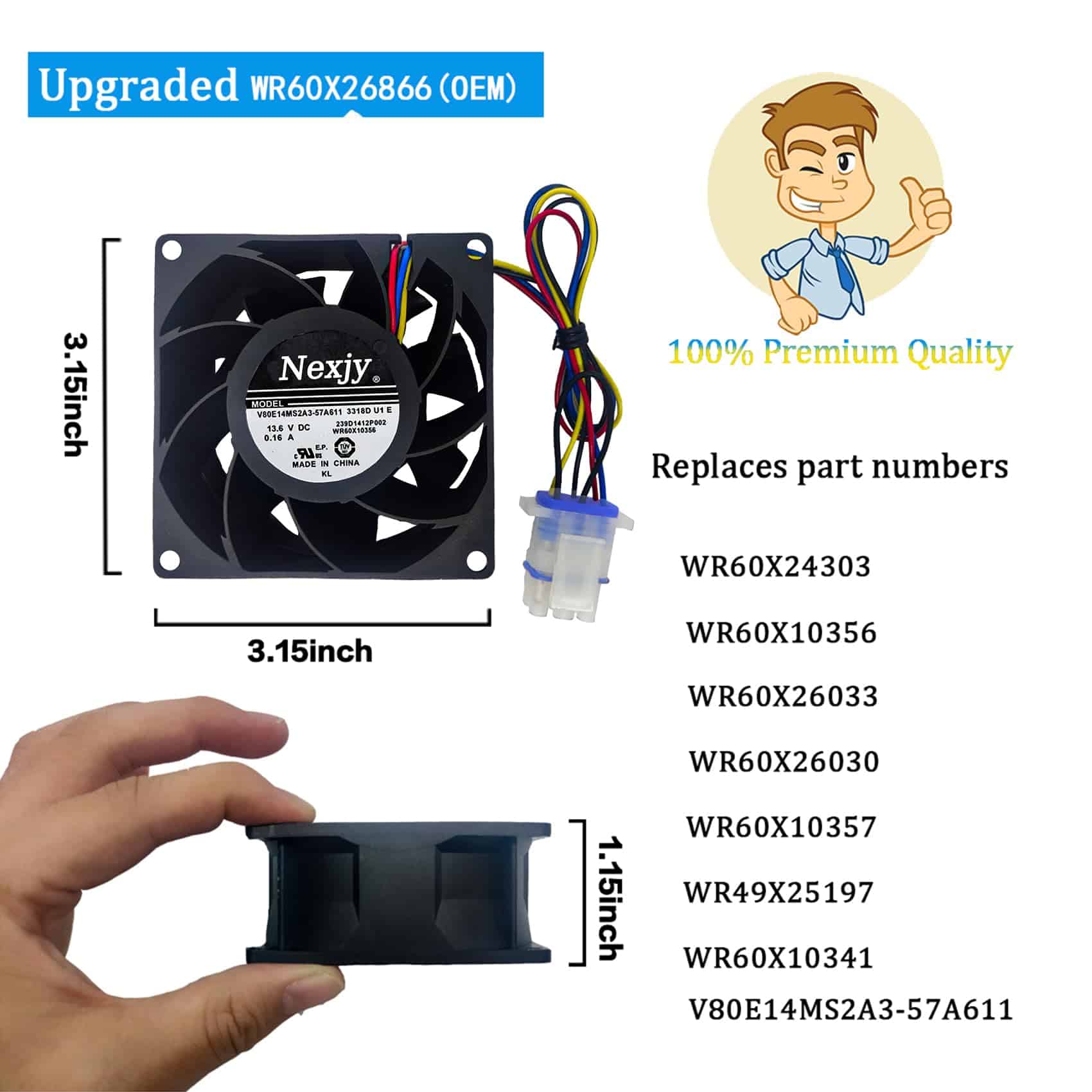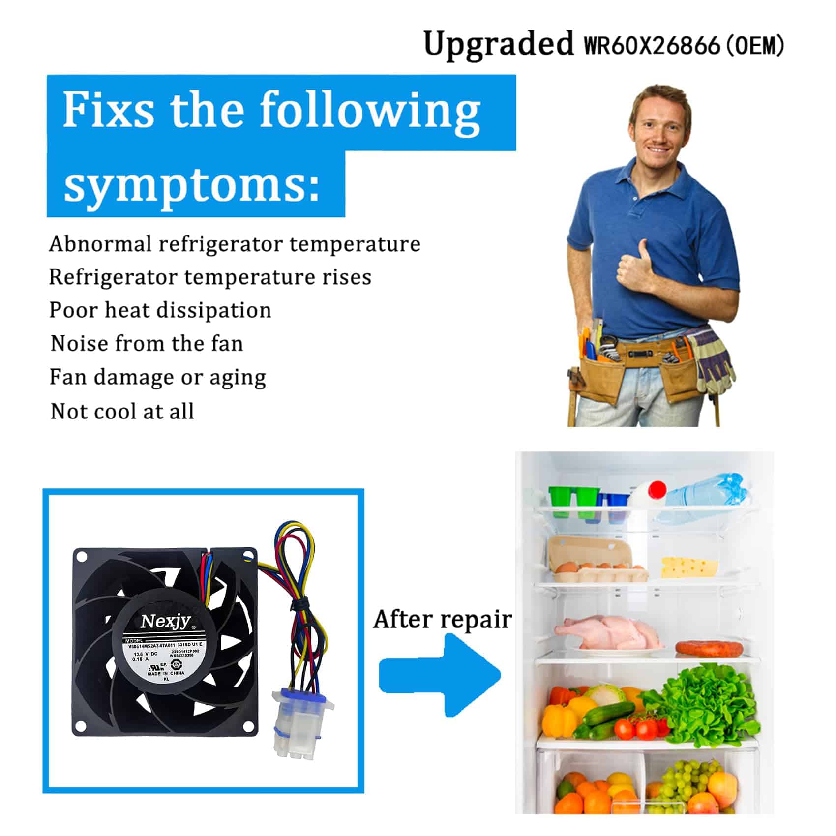 Motor del ventilador evaporador WR60X26866 (OEM) para refrigerador, circula el aire a través de la cámara de frescura para una refrigeración eficiente. Soluciona perfectamente problemas como temperatura anormal del refrigerador y ruido anormal del motor del ventilador. Fácil instalación. Compatible con varios modelos de refrigeradores GE. No requiere actualizaciones de software. De alta calidad con garantía de 10 años. Servicio de atención al cliente de postventa de alta calidad.