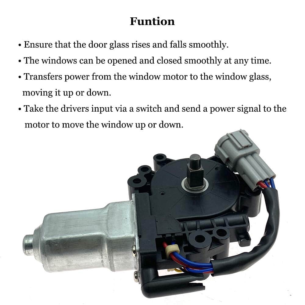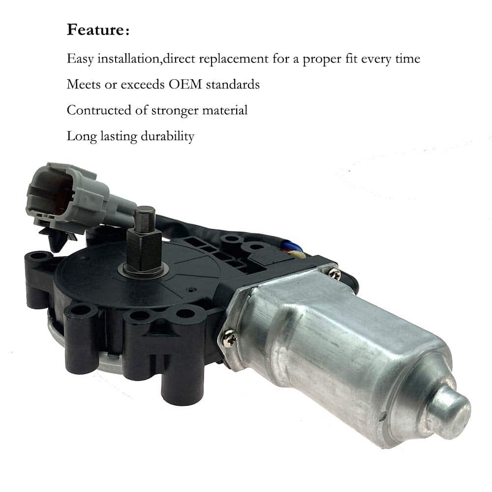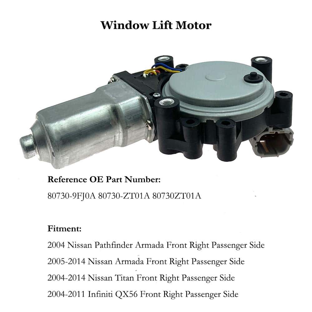 Motor Elevador de Ventana Eléctrico delantero derecho para Nissan Pathfinder Armada 2004, Nissan Armada 2005-2014, Nissan Titan 2004-2014, Infiniti QX56 2004-2011. Construido con material de alta calidad para evitar desgaste prematuro, rayado y rotura, está diseñado para una durabilidad duradera. Tiene una vida útil larga. Fabricado con material reforzado y diseñado con un motor de par adicional para evitar fallas prematuras de los reguladores de elevación de ventanas lubricados de manera incorrecta. Especialmente diseñado para coincidir con el regulador de la puerta y la ruta del vidrio para garantizar una conducción suave y lograr la mejor velocidad de la ventana. La función potente toma la entrada del conductor a través de un interruptor y envía una señal de potencia al motor para mover la ventana hacia arriba o hacia abajo. El regulador de ventana transfiere la potencia del motor de la ventana al vidrio de la ventana, moviéndolo hacia arriba o hacia abajo. Si tiene síntomas como que se necesitan múltiples pulsaciones para subir o bajar la ventana, la velocidad de la ventana es más lenta o más rápida de lo habitual, clics desde la puerta cuando la ventana sube o baja, o la ventana eléctrica no se mantiene levantada o está torcida, es posible que necesite reemplazar su Viejo Motor de Ventana. Número de parte OE de referencia 80730-9FJ0A 80730-ZT01A 80730ZT01A. Compatibilidad Para Nissan Pathfinder Armada 2004, Nissan Armada 2005-2014, Nissan Titan 2004-2014, Infiniti QX56 2004-2011. Compre con Confianza Ordene de Syconeer, totalmente probado antes de enviar, además ofrecemos 12 meses de garantía, una verdadera experiencia de compra sin preocupaciones