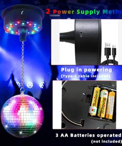 Motor giratorio de bola de discoteca DGRIVERGOD con cadena Velocidad ajustable de 5-10 RPM, Motor de bola de espejo alimentado por enchufe / batería con 24 cuentas LED para iluminación de discoteca. Adecuado para bola de discoteca de 6 8 12 pulgadas (no incluida). Este motor de bola de discoteca es ideal para bolas de espejo de 6 pulgadas, 8 pulgadas, 10 pulgadas y 12 pulgadas, brindando una solución conveniente para colgar y montar la bola de espejo. La velocidad de rotación de 5 a 9 RPM se controla fácilmente girando el interruptor de perilla blanca. Con 24 vibrantes cuentas LED, este motor emite una luz colorida y vibrante que crea reflejos y refracciones fascinantes cuando brilla sobre la bola de espejo, estableciendo instantáneamente un ambiente alegre y festivo. Puede ser alimentado por enchufe (incluye 1 cable USB tipo C) o por 3 pilas AA (no incluidas), lo que permite una flexibilidad adicional. Ideal para decorar fiestas, este motor de disco es perfecto para fiestas temáticas de los años 70 y 80, reuniones de familias y cualquier evento que requiera un ambiente animado y emocionante