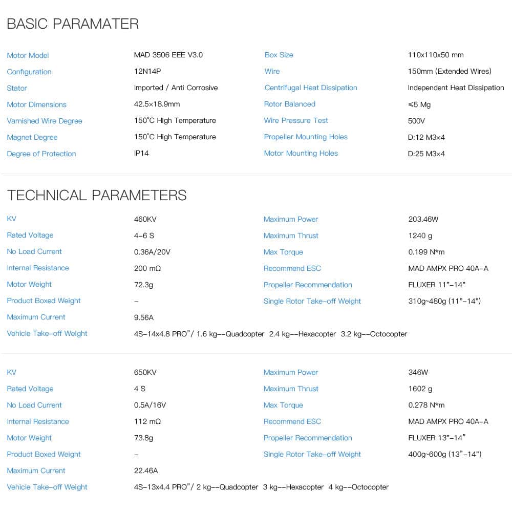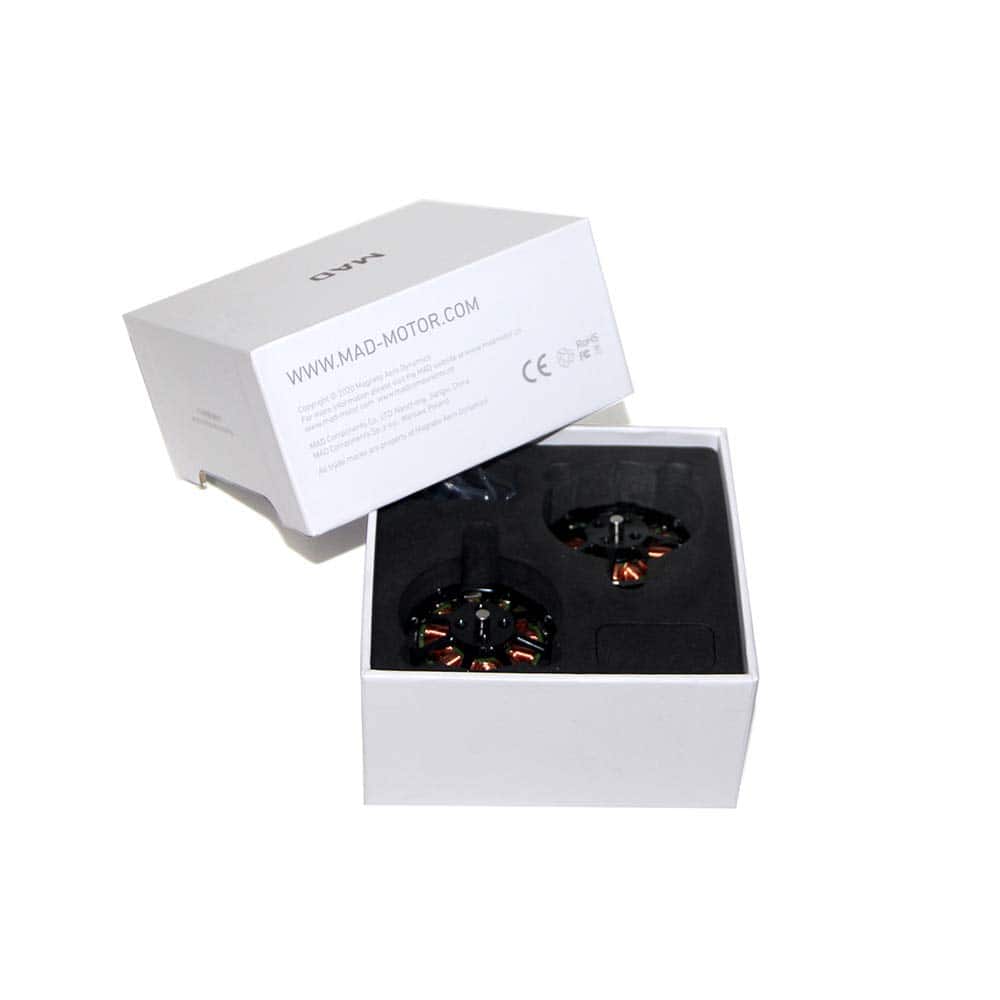 Motor sin escobillas MAD 3506 EEE para Drones (2PCS INCLUIDOS). Los motores MAD de la Serie 35 son los motores UAV clásicos para uso industrial pequeño a mediano, eficientes y para vuelo de resistencia. Estos tamaños de motores han estado en el mercado durante 10 años, MAD Components los optimizó para un diseño muy ligero. EDICIÓN EXTREMA PARA ENTUSIASTAS para una reducción extrema de peso manteniendo el rendimiento más alto posible. Diseño de cuerpo abierto para una mejor disipación pasiva de calor. Compatibilidad de instalación de hélices. Peso reducido del motor. Estandarización de los agujeros de montaje del motor. Opción de KV: 400KV 460KV 650KV