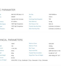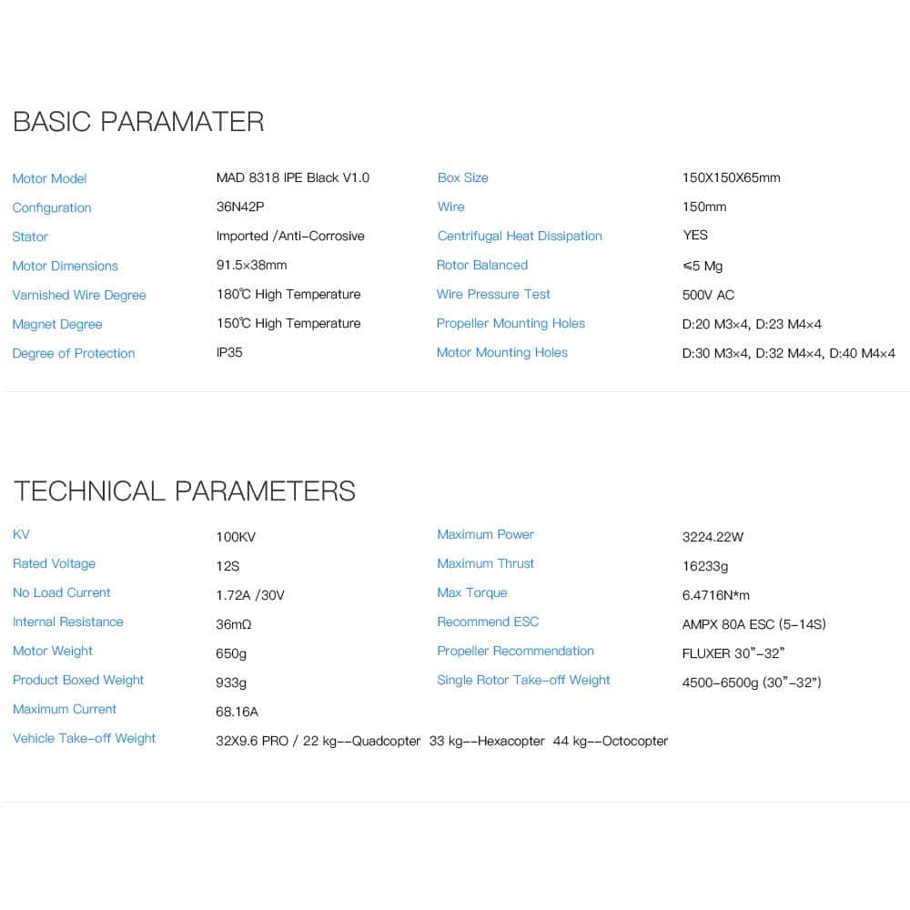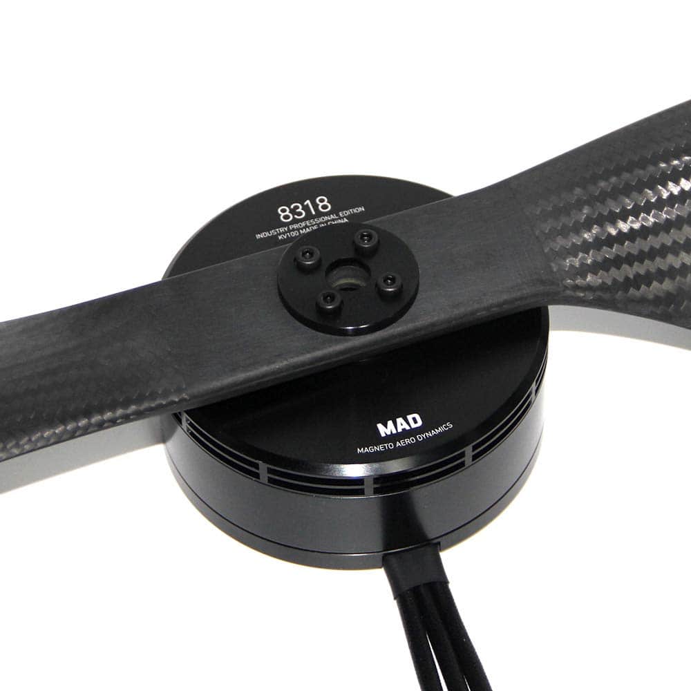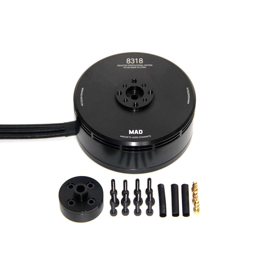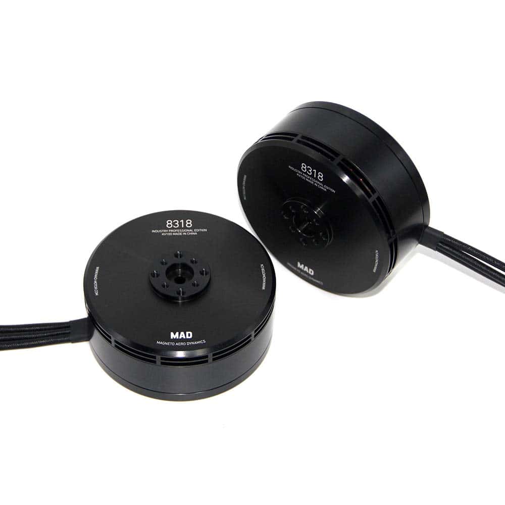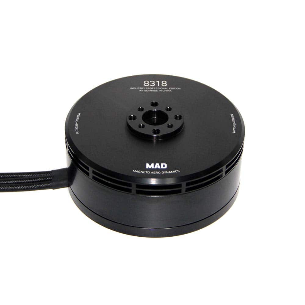 MAD 8318 IPE Heavy Lift Motor sin escobillas diseñado para aplicaciones agrícolas, resistente al entorno riguroso. Alta carga, alta eficiencia, confiable y larga vida útil, resistente al agua y al polvo IP35. MAD8318 Max empuje 17.5 kg, utilizando hélice de 28-32 pulgadas. Ampliamente utilizado en drones agrícolas, alto rendimiento y muy rentable. Diseñado para condiciones rigurosas, aplicaciones agrícolas de elevación pesada con rodamientos duraderos sobredimensionados para aumentar la vida útil y la resistencia al agua y al polvo. IP35 grado de protección con orificios de montaje de motor estandarizados. Opción de KV: 100KV120K.