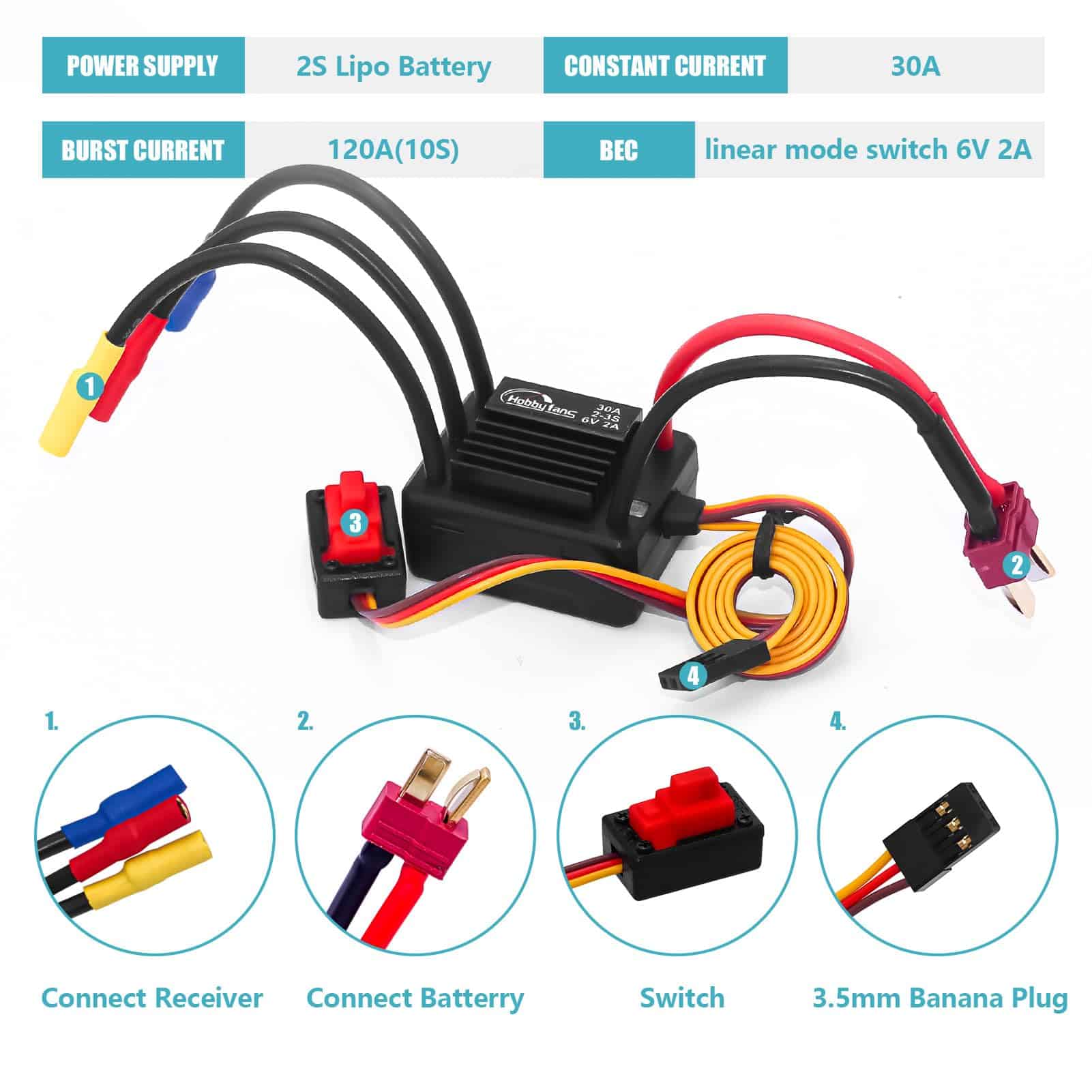 5. ESC de 30A: El ESC tiene una respuesta de aceleración mejorada, excelente aceleración, interrupciones potentes y una línea de aceleración super suave y precisa.