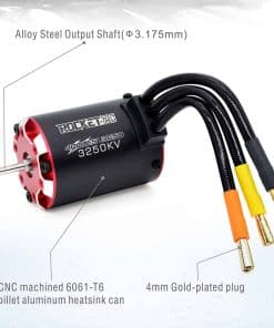 Especificaciones: Tipo de artículo: Motor sin escobillas 3650 3250KV Material: Aleación de aluminio + cobre + plástico Color: Negro Modelo de motor: 3650KV (RPM/Volt): 3250KV Potencia: 900W Voltaje máximo: 16V Corriente máxima: 56A Velocidad máxima: 50000 Corriente sin carga: 2.9A Número de polos del motor: 4 Resistencia interna ( ): 0,0095 Longitud del motor: Aprox. 50 mm / 2.0 pulgadas (sin eje) Diámetro del motor: Aprox. 36 mm / 1.4 pulgadas Diámetro del eje: Aprox. 3.175 mm / 0.13 pulgadas Longitud del eje: Aprox. 15 mm / 0.6 pulgadas Conector enchapado en oro: Aprox. 4.0 mm / 0.16 pulgadas ESC de 60A: Corriente continua: 60A Corriente instantánea: 360A Tipo de motor: Motor sin escobillas no inductivo Resistencia interna: 0,0007ohm Batería: Batería de litio 2-3S / NiMH 4-9S Salida BEC: 5,8V/5V (modo de conmutación) Tamaño del producto: Aprox. 50x35x34mm / 2.0×1.38×1.34 pulgadas Tipo de conector: XT60 a T Plug Aplicación: para Coche de Control Remoto 1/10 (por ejemplo: para Tamiya / para Traxxas) Lista de paquetes: 1 x Motor sin escobillas 3650 1 x ESC de 60A 1 x Conector XT60 a T Plug 4 x Tornillo 2 x Manual Nota: 1. Debido a la medición manual, permita un error de 13 mm. ¡Gracias! 2. La calibración del monitor no es consistente, el color del artículo mostrado en la foto puede ser ligeramente diferente del objeto real. 3. Descargue el agua del ventilador de enfriamiento antes de usar este ESC; limpie y seque inmediatamente después de usar para evitar que el conector se oxide.