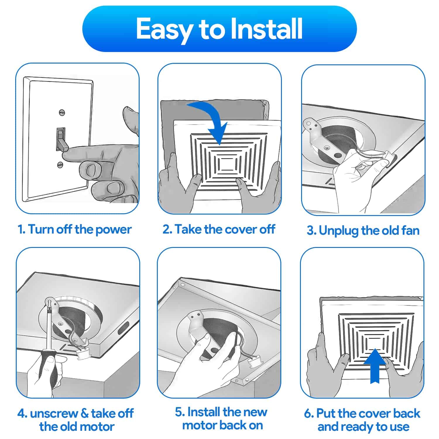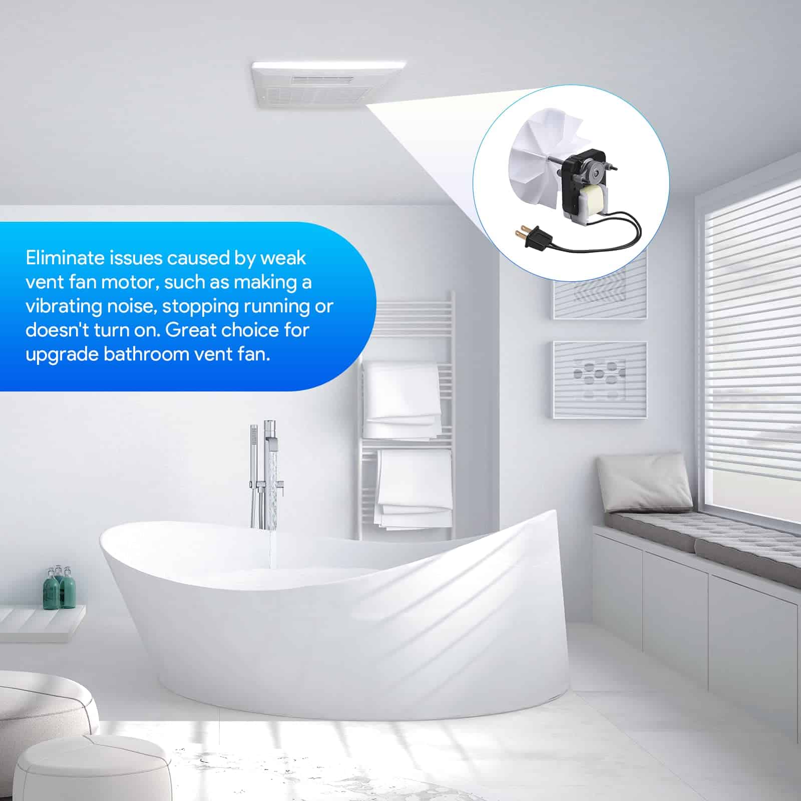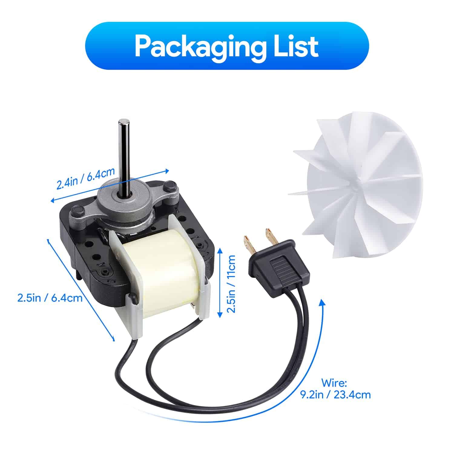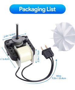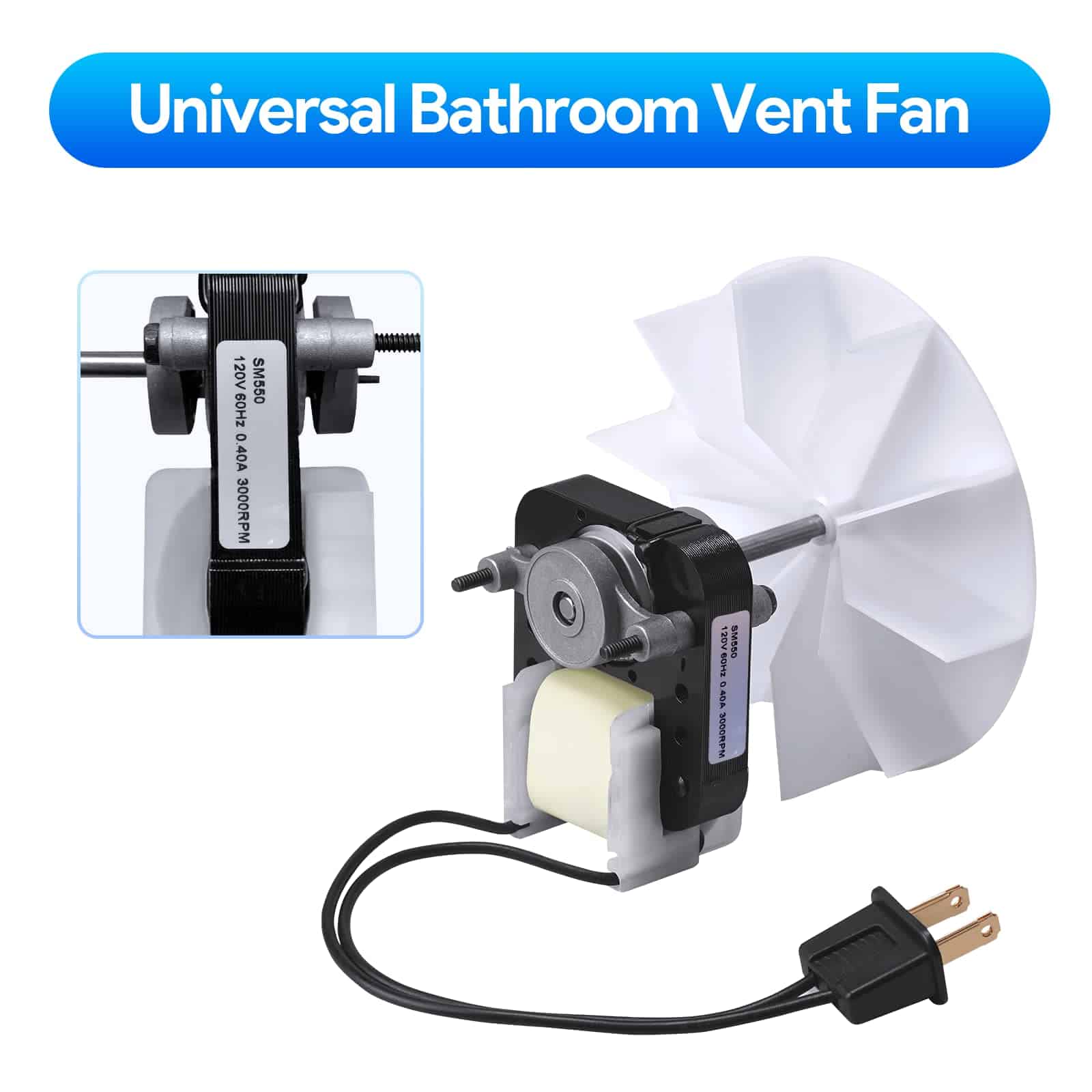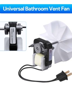 Este motor de repuesto es para ventiladores de extracción de baño y campanas de ventilación, compatible con marcas como Nutone Broan, Bay Motors, Uppco, Ventorola E498-1, Sears 569, Dayton, entre otros. Reemplaza los modelos EM550, 65100, C65878, VFM100, E498-1, 82423K, K111, EM750, SM550. Funciona a 120 Volts, 60Hz, 50CFM, 0.40 amperios, 3000 Rpm. El motor y la rueda sopladora vienen desmontados para una instalación fácil. Hechos con acero inoxidable de alta calidad y probados en fábrica. Incluye: 1 x motor, 1 x rueda de 4.5 pulgadas.