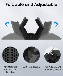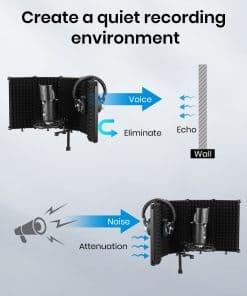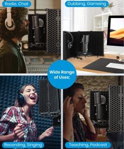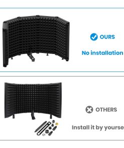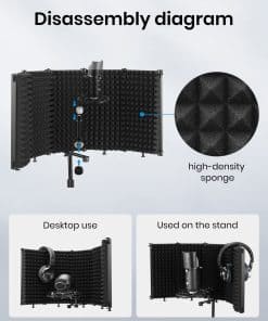 1. Elimine la interferencia de ruido: El escudo aislante para micrófono Moukey cuenta con capas REFLECTANTE & FILTRANTE & ABSORBENTE, la capa interna está hecha de espuma acústica de alta densidad que elimina eficazmente los rebotes de ondas de audio e interferencias, funciona bien para reducir el sonido ambiente y darle grabaciones limpias. 2. Fácil de usar: Solo se necesitan minutos para desplegar este escudo de sonido para grabación, que se puede fijar en un escritorio o mesa para emisiones en directo, y también se puede montar en un soporte de micrófono para su grabación profesional. Adecuado para trabajo diario, creación personal, estudio de grabación, estación de radio. 3. Plegable y ajustable: Nuestro escudo de aislamiento vocal está compuesto por 5 paneles, y el diseño plegable le permite ser muy flexible tanto para guardarlo como para llevarlo. Es fácil ajustar el diseño del arco, permite ajustes de ángulo para un aislamiento de sonido óptimo y garantiza grabaciones de la más alta calidad. 4. Duradero y seguro: El panel trasero de nuestro escudo de sonido está construido con un material ABS resistente y duradero para garantizar solidez y un rendimiento duradero. Los puntos de soporte del panel acústico son de diseño antideslizante, por lo que no hay necesidad de preocuparse por que se caiga con un ligero toque. 5. Universal y compatible: Se incluyen tuercas metálicas de conversión de 3/8 a 5/8, que son compatibles con la mayoría de los soportes para micrófono y amortiguadores de golpes. Ya no tendrá que preocuparse por la compatibilidad.