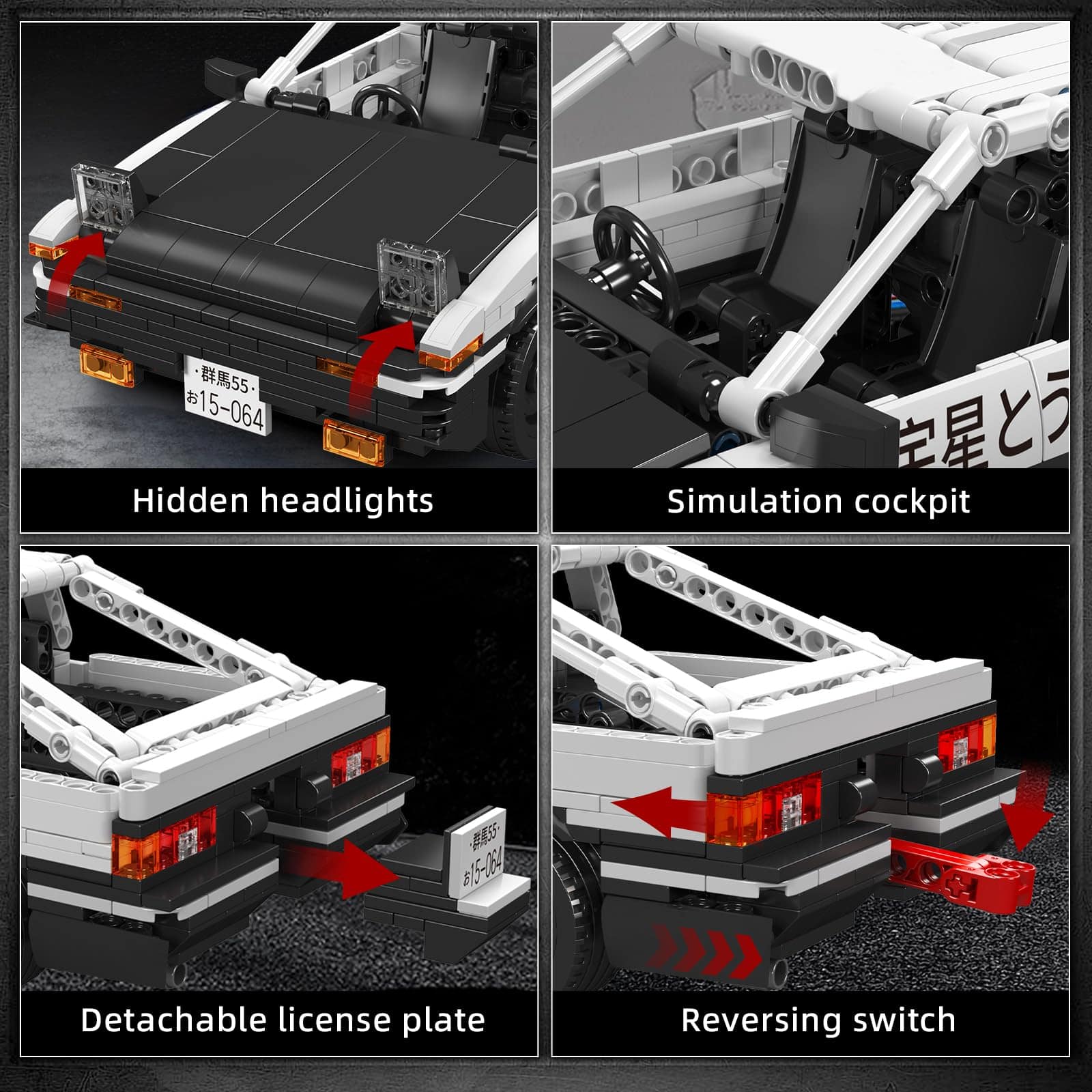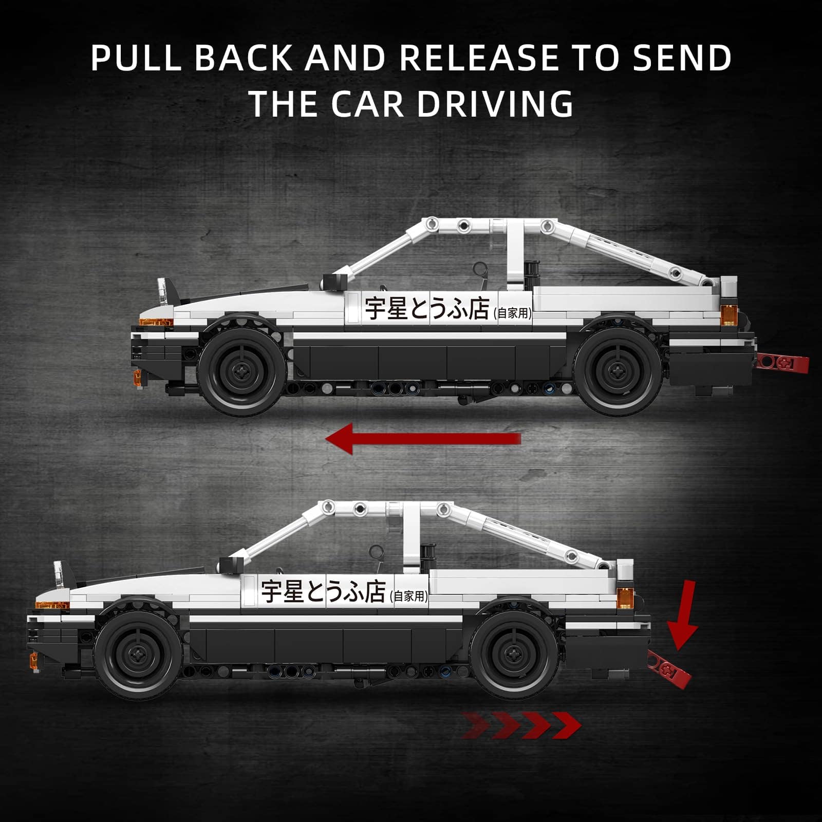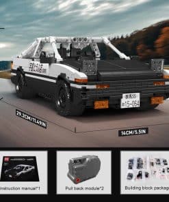 2. El coche de juguete de carreras de arrastre Pull-Back de Mould King 15064 es una versión dinámica, con 2 módulos de retroceso, retroceder y soltar para enviar el coche conduciendo. Ambos lados de las puertas y el capó del coche AE86 de la serie Inicial D se pueden abrir.