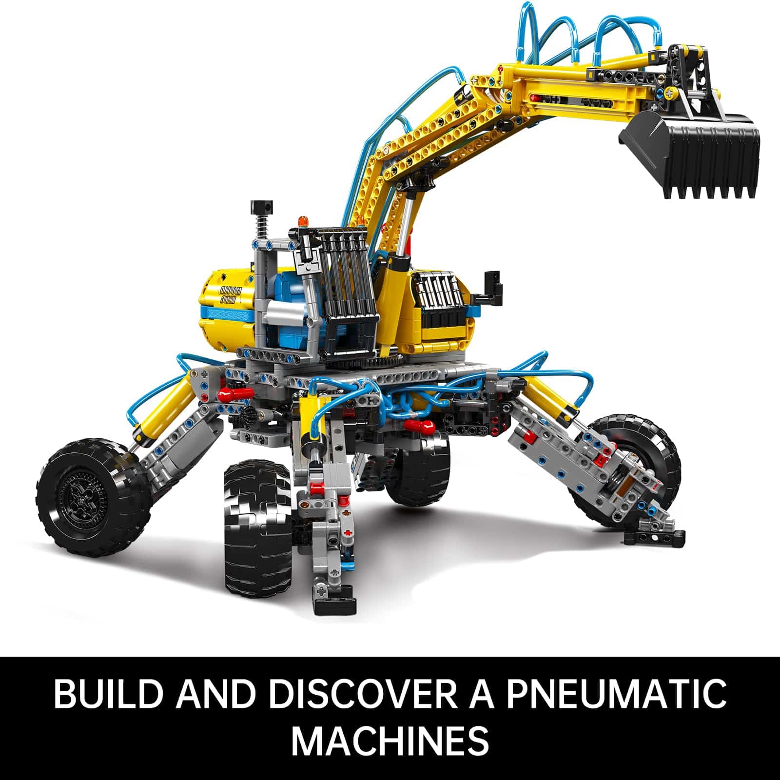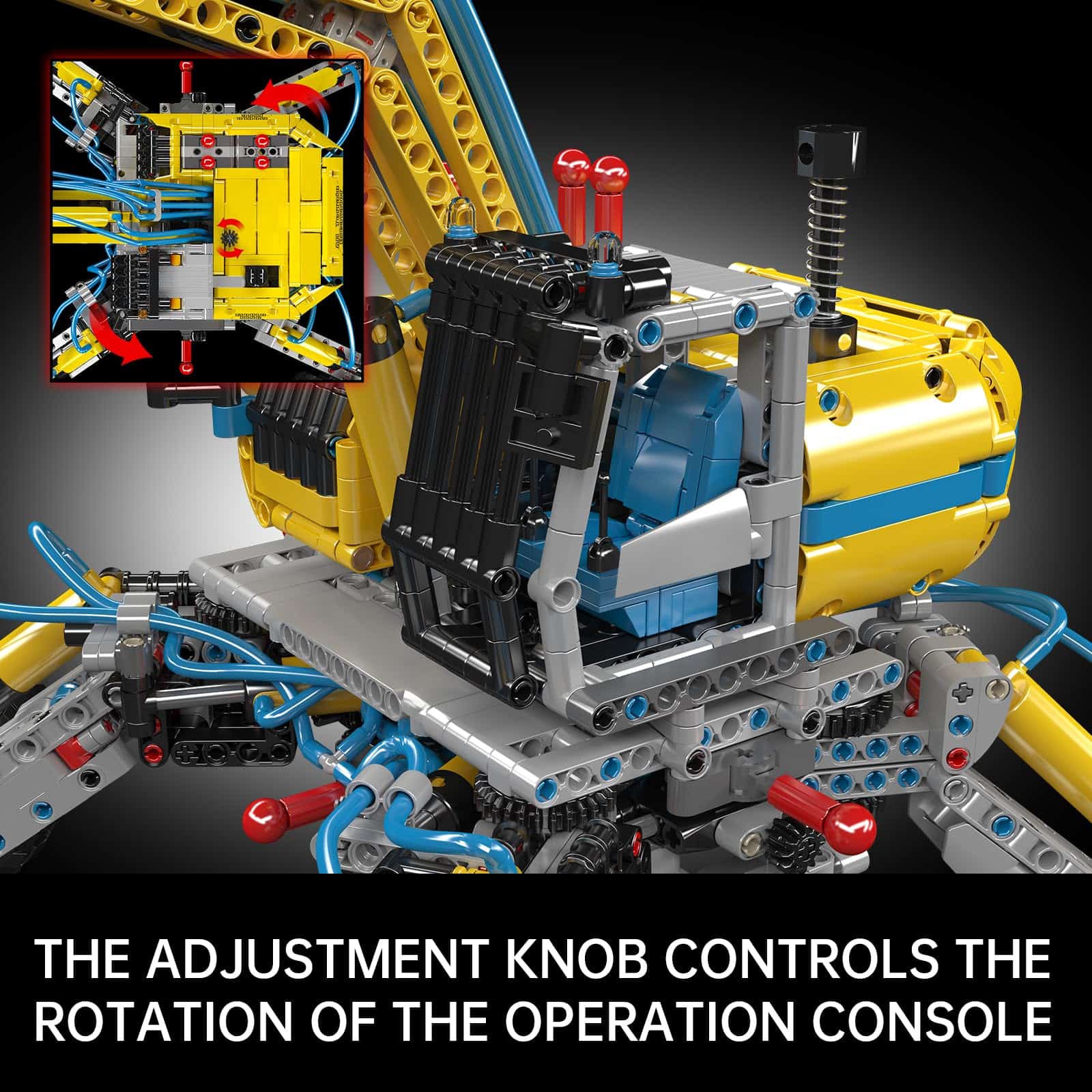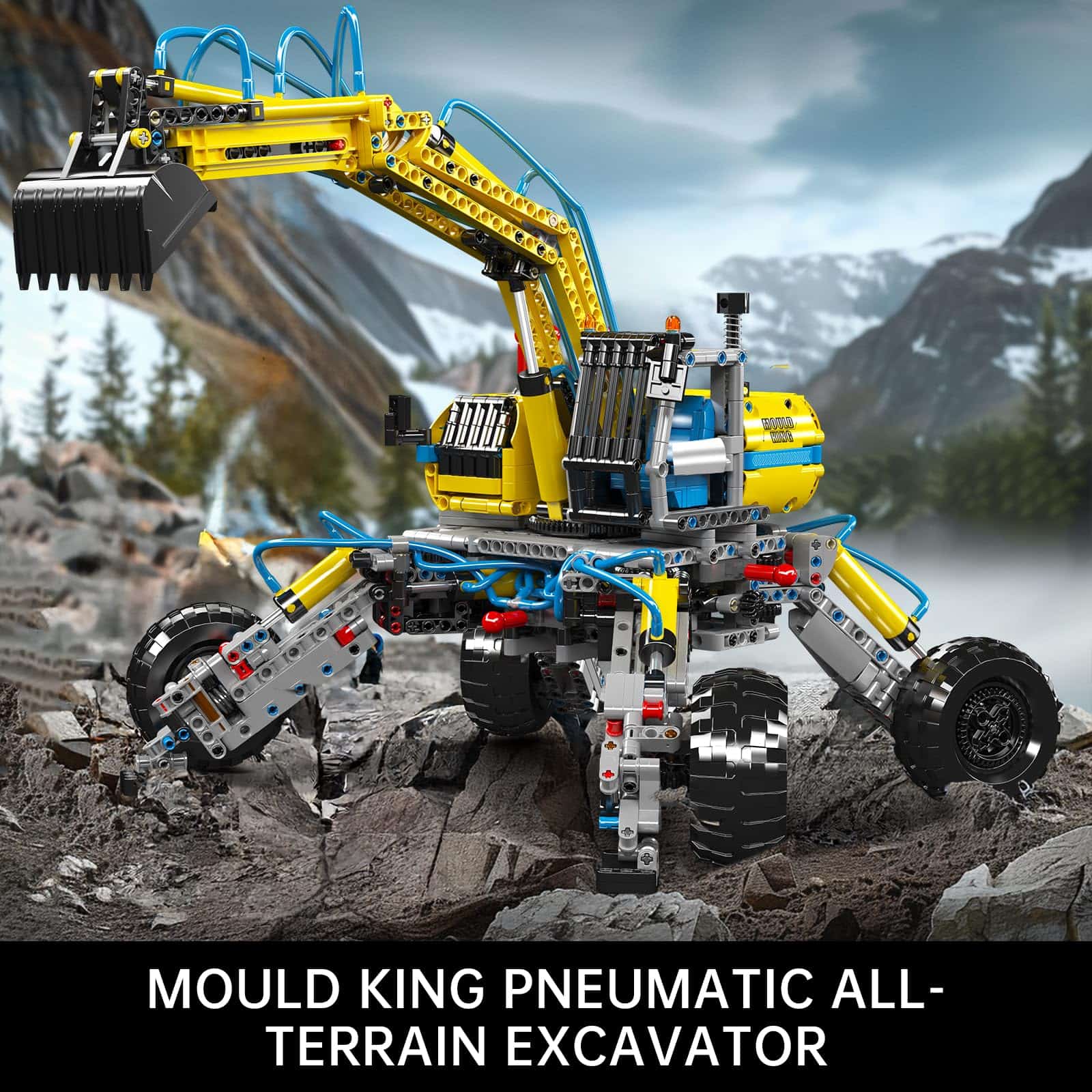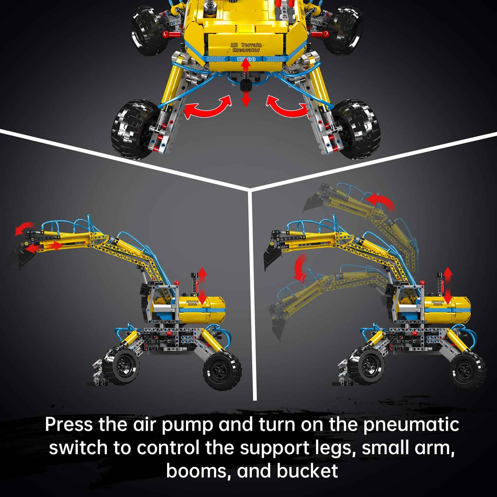 2. Funciones neumáticas: este conjunto de excavadoras Mould King cuenta con funciones manuales y neumáticas para que los niños aprendan cómo funcionan estos juguetes de ingeniería. Estos juguetes cuentan con movimientos y mecanismos realistas. Tales como presionar la bomba de aire y encender el interruptor neumático para controlar las patas de apoyo, el brazo pequeño, los brazos y el cucharón.