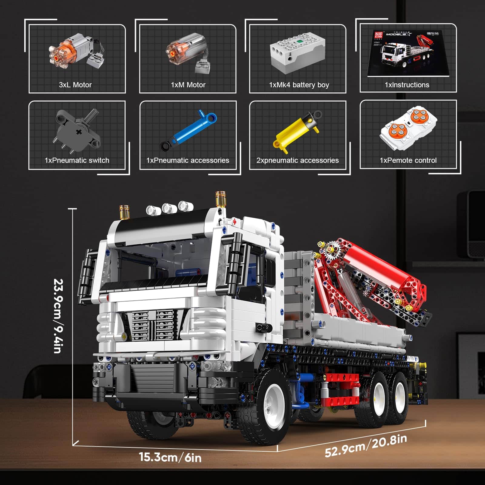 3. Tiene alrededor de 2530 piezas. Todas las partes están empaquetadas en bolsas numeradas de embalaje independiente, lo que facilita el montaje de los kits de construcción. El paquete incluye la batería recargable, motores, control remoto y piezas neumáticas.