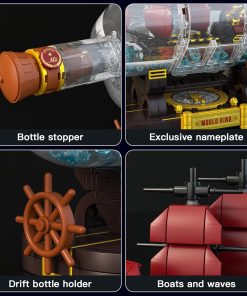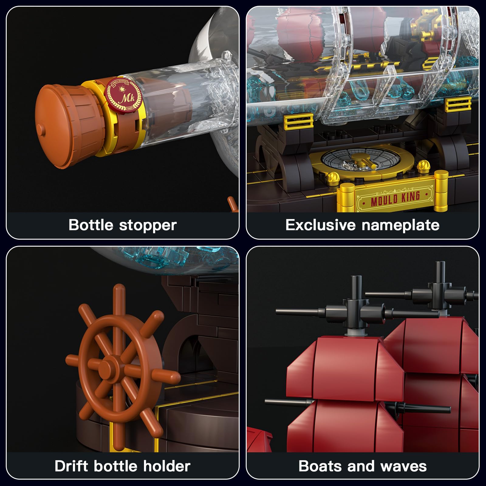 2. Mini Barco Coleccionable: Este es un juego de barco en una botella de los Sets de Construcción Mould King. Con los ladrillos de construcción del mini barco y los ladrillos de construcción azules claros diseñados en la botella del kit de bloques de construcción. El aspecto también está inspirado en un clásico barco pirata famoso en el mundo.
