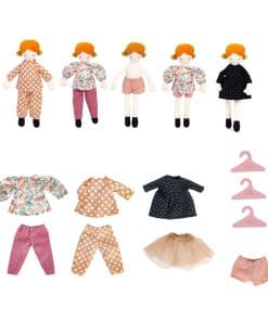 Esta encantadora muñeca parisina Mademoiselle Blanche viene completa con un maletín de armario y una selección de tres conjuntos elegantes, incluyendo un vestido y pijamas. Esta dulce muñeca mide aproximadamente 26 cm con cabello de terciopelo naranja en moños y zapatos negros con lunares dorados. Esta muñeca de Moulin Roty viene completa con un maletín de armario bellamente ilustrado hecho de cartón resistente. Dentro del maletín encontrarás un espejo, una barra para colgar la ropa y un cajón.