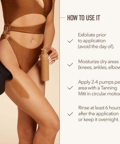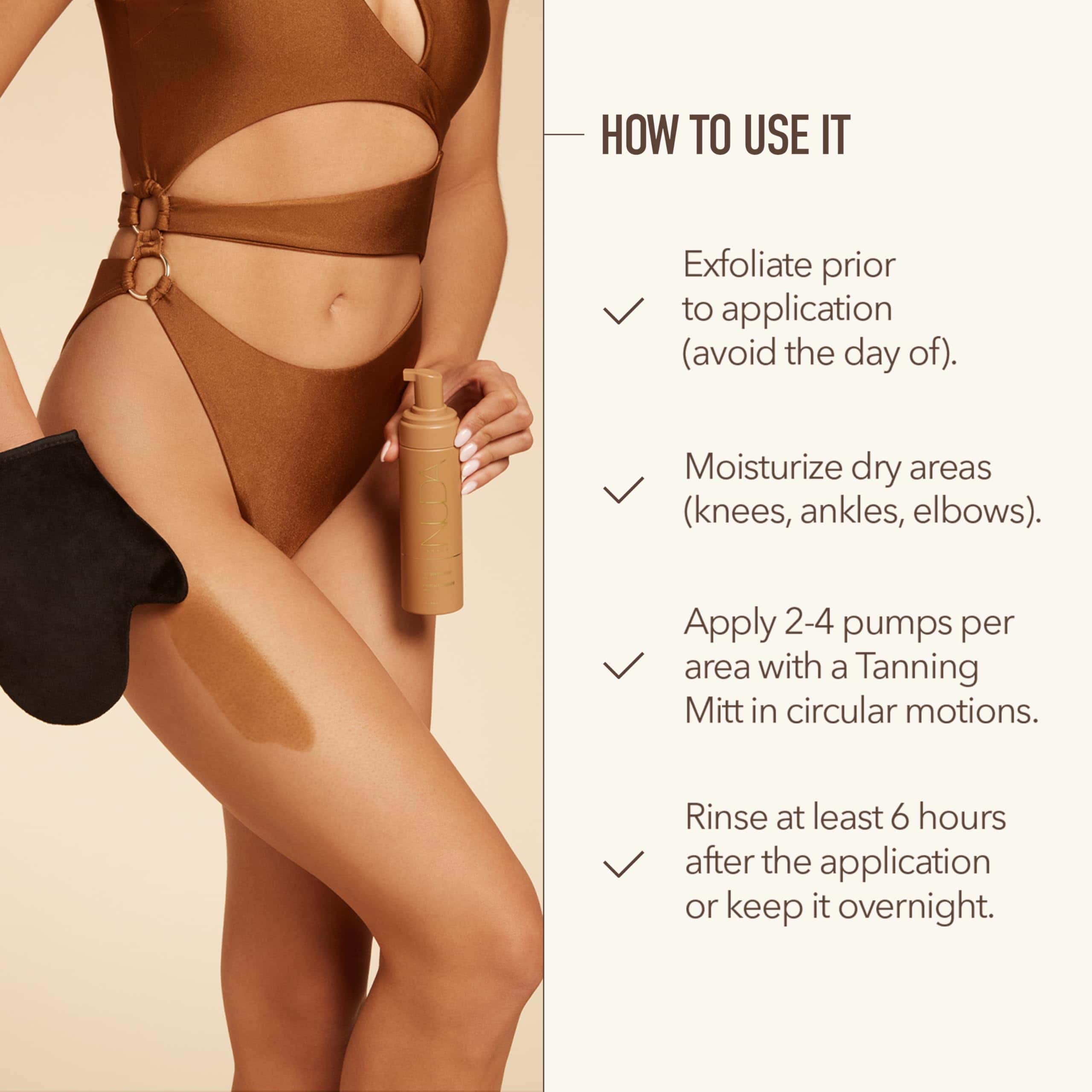 2. MOUSSE AUTOBRONCEADOR FÁCIL DE APLICAR: Exfoliar días antes de aplicar. No exfolies, laves ni afeites el día de la aplicación. Hidrata áreas secas, incluyendo rodillas, tobillos, pies, codos y nudillos. Dispensa 2-4 bombas de mousse autobronceador en nuestro guante autobronceador. Aplica sobre la piel seca, limpia y sin ropa en un movimiento circular hasta que se mezcle uniformemente. Espera 6 horas antes de ducharte con agua tibia.