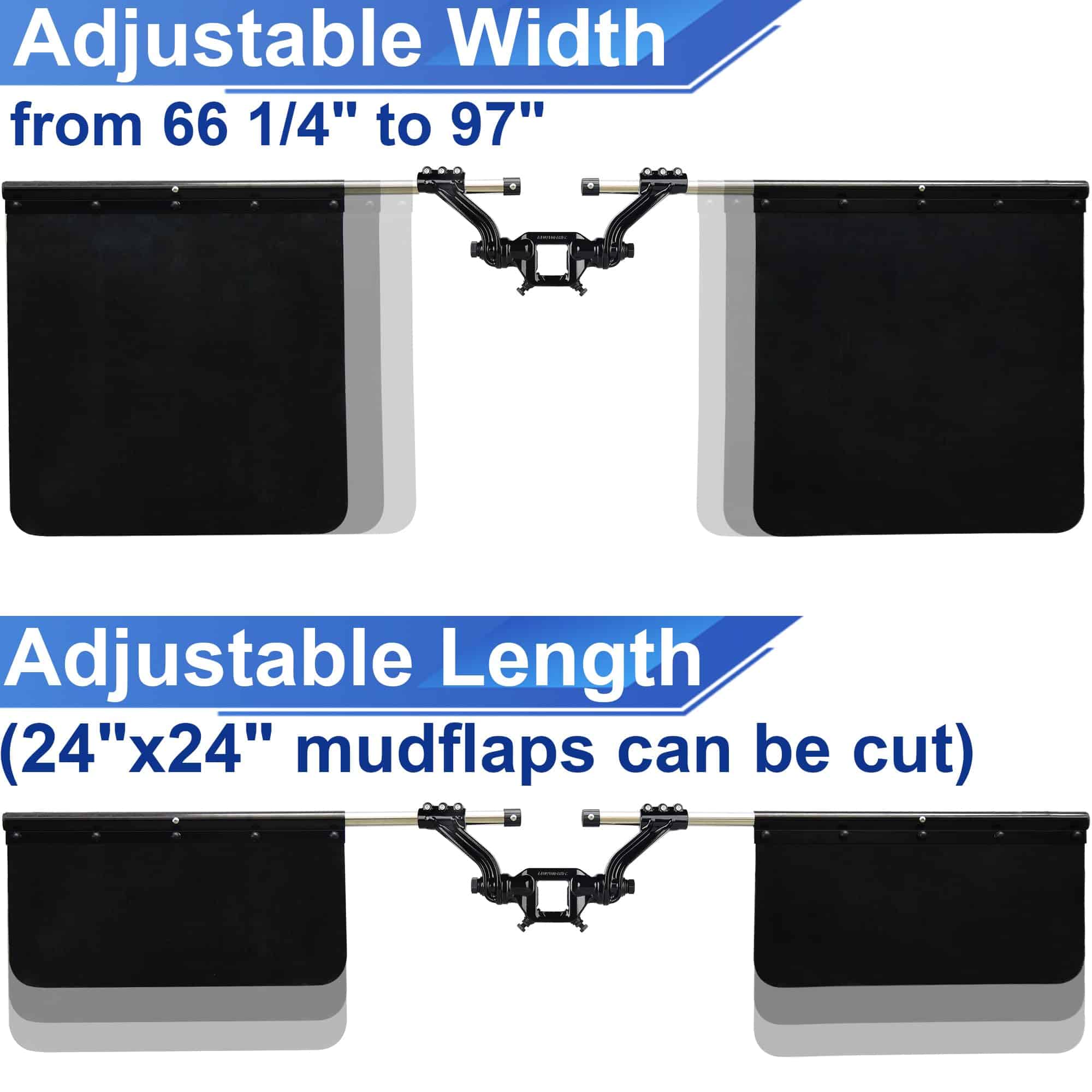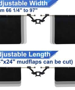 2. Longitud y ancho ajustables: Hay agujeros en el brazo para ajustar diferentes anchos de 67″ a 97″, las solapas para camiones de 24″ x 24″ pueden ser cortadas a la longitud que desee. Las solapas para camiones se adaptan a la mayoría de los vehículos.