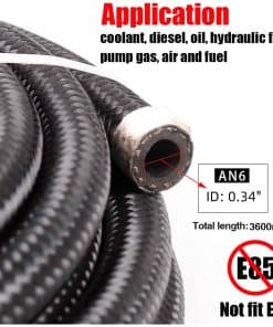5. Incluido: Una manguera de combustible trenzada de nylon de 12 pies, dos extremos de manguera de 90 grados, dos extremos de manguera de 45 grados, dos extremos de manguera de 0 grados, dos abrazaderas de manguera y una cinta adhesiva. Los accesorios para la manguera de combustible están hechos de aluminio T6061, acabado anodizado para una alta resistencia y durabilidad.