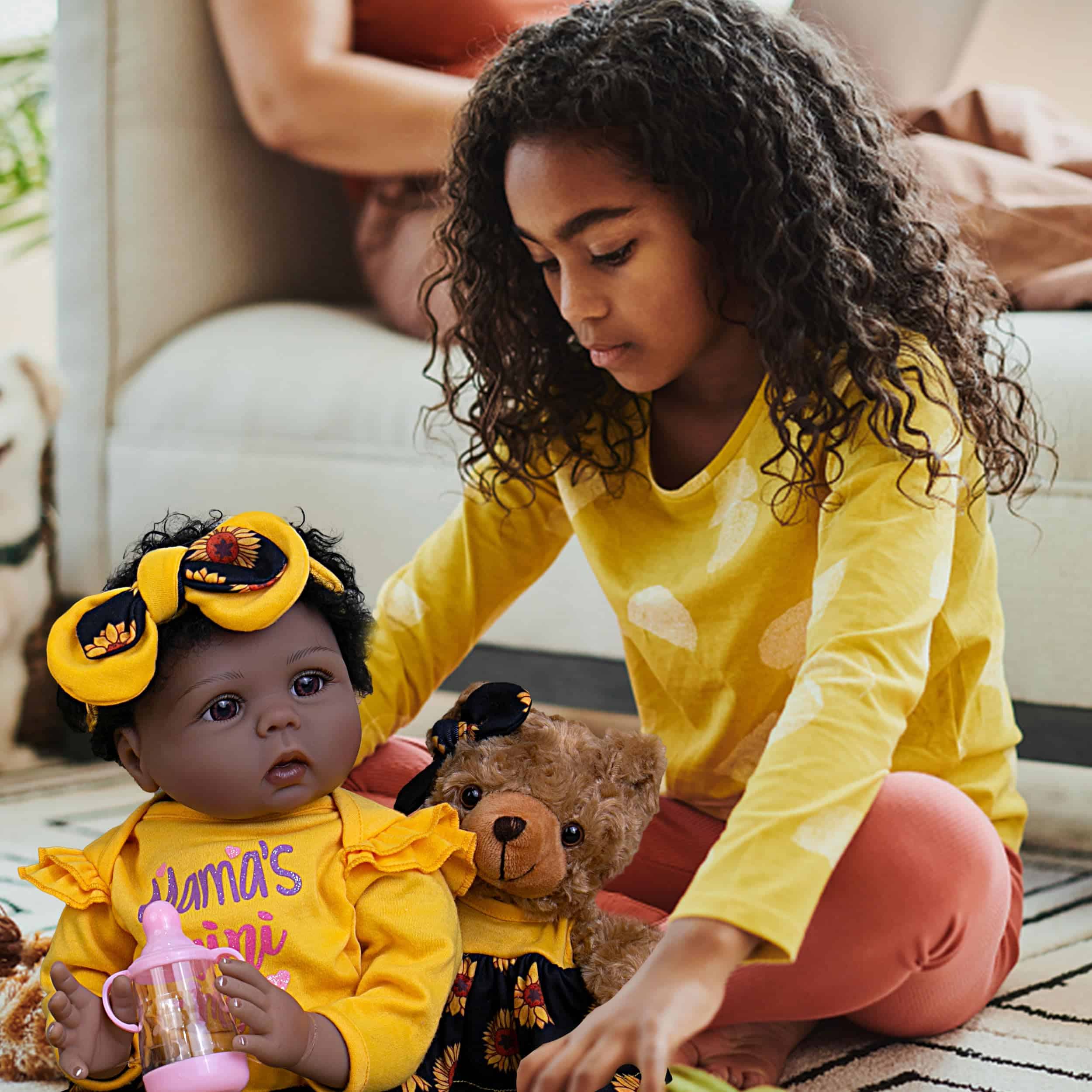 1. Tema de Girasol Dulce: La niña reborn está vestida con un romper estampado brillante con volantes florales y pantalones con más girasoles. La gorra amarilla con gran lazo de girasol se ve tan adorable en su cabello implantado a mano. El oso de peluche con un vestido de algodón a juego y accesorios para el cabello con lazo completan el look.