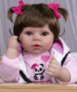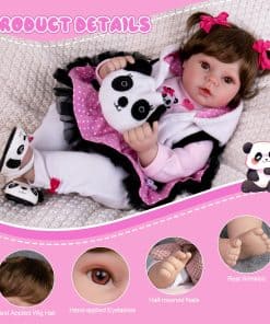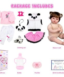 Aori es una nueva fuerza en la industria del juguete, especializada en producir muñecas bebé renacidas. Estamos dedicados a ofrecer a los amantes y coleccionistas de todo el mundo las muñecas renacidas más innovadoras y realistas. Nos centramos mucho en los detalles de las muñecas renacidas: las expresiones faciales agradables, cabello hecho a mano, hermosas y bien ajustadas prendas, el vinilo de silicona más seguro, dedos y dedos de los pies pintados a mano, y costuras firmes. La muñeca Aori garantiza que tienes un servicio al cliente 100% satisfactorio. Nuestro objetivo es crear la muñeca perfecta para conservar la bondad y la belleza en los momentos de la vida. Especificaciones: Tamaño: 22 pulgadas de la cabeza a los pies Peso: 3.4 libras Material: cabeza de vinilo de silicona, extremidades de vinilo de silicona del 3/4 con cuerpo de algodón PP relleno y cuentas de vidrio Cabello: cabello falso hecho a mano. Se puede lavar, pero debe secarse a baja temperatura Ojos: material acrílico, abiertos pero no pueden parpadear Caja que incluye: 1 Muñeca bebé renacida, 1 set de trajes (como en la imagen), 1 bolso de panda, 1 chupete magnético, 1 biberón, 1 certificado de nacimiento, 1 tarjeta de servicio