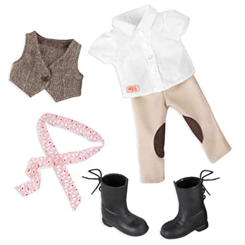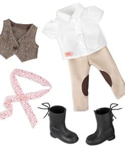 A las chicas de Nuestra Generación les encanta montar a caballo y explorar el campo. Estamos ensillando nuestros propios caballos y abriendo nuestros propios caminos. Estar con nuestros caballos es lo que hace tan dulce la vida. Leah está lista para salir a montar con su adorable conjunto que incluye una camisa, chaleco, pantalones de montar, un par de braguitas y un par de botas de montar. ¡Combínala con uno de los caballos de Nuestra Generación de 20″ para aún más diversión al montar!