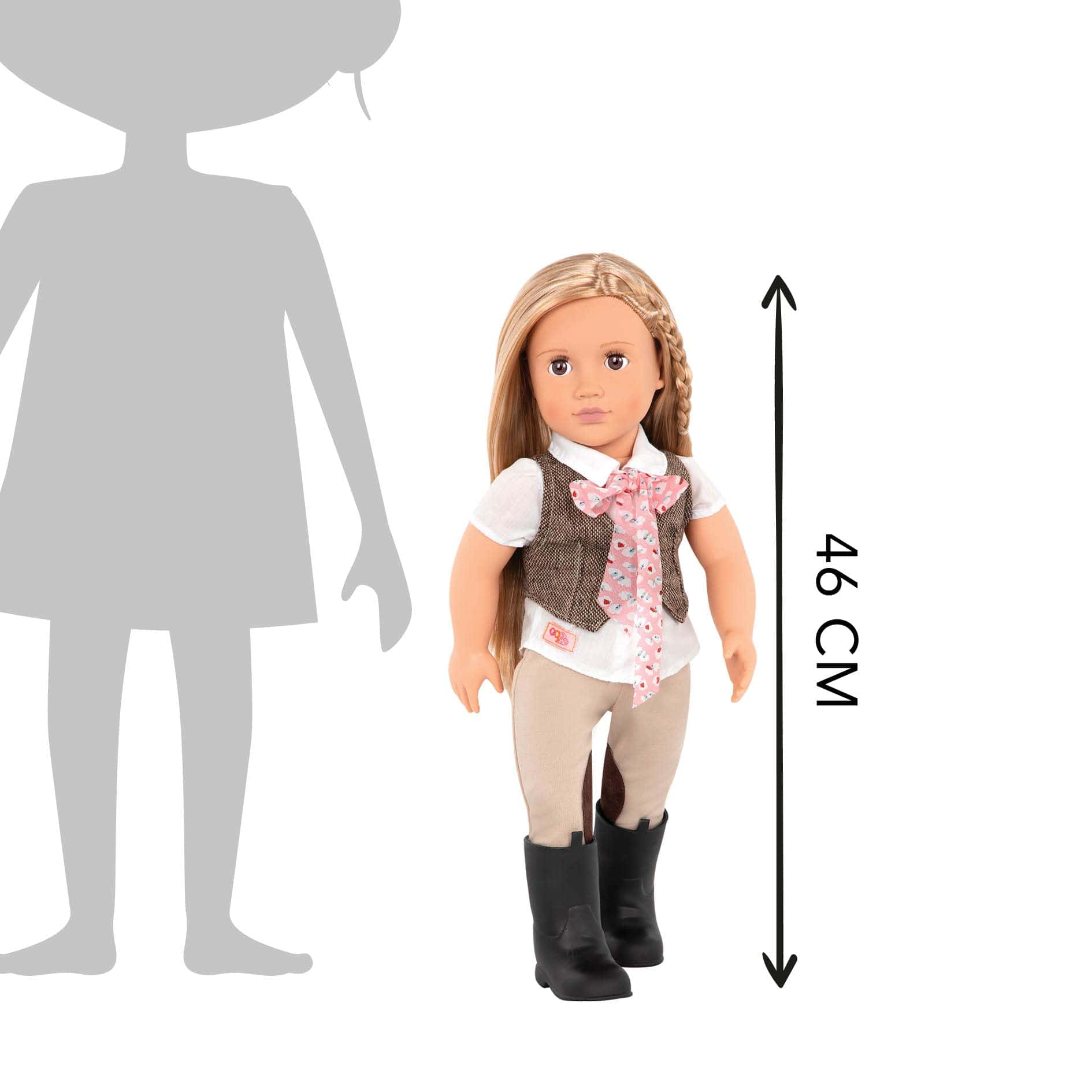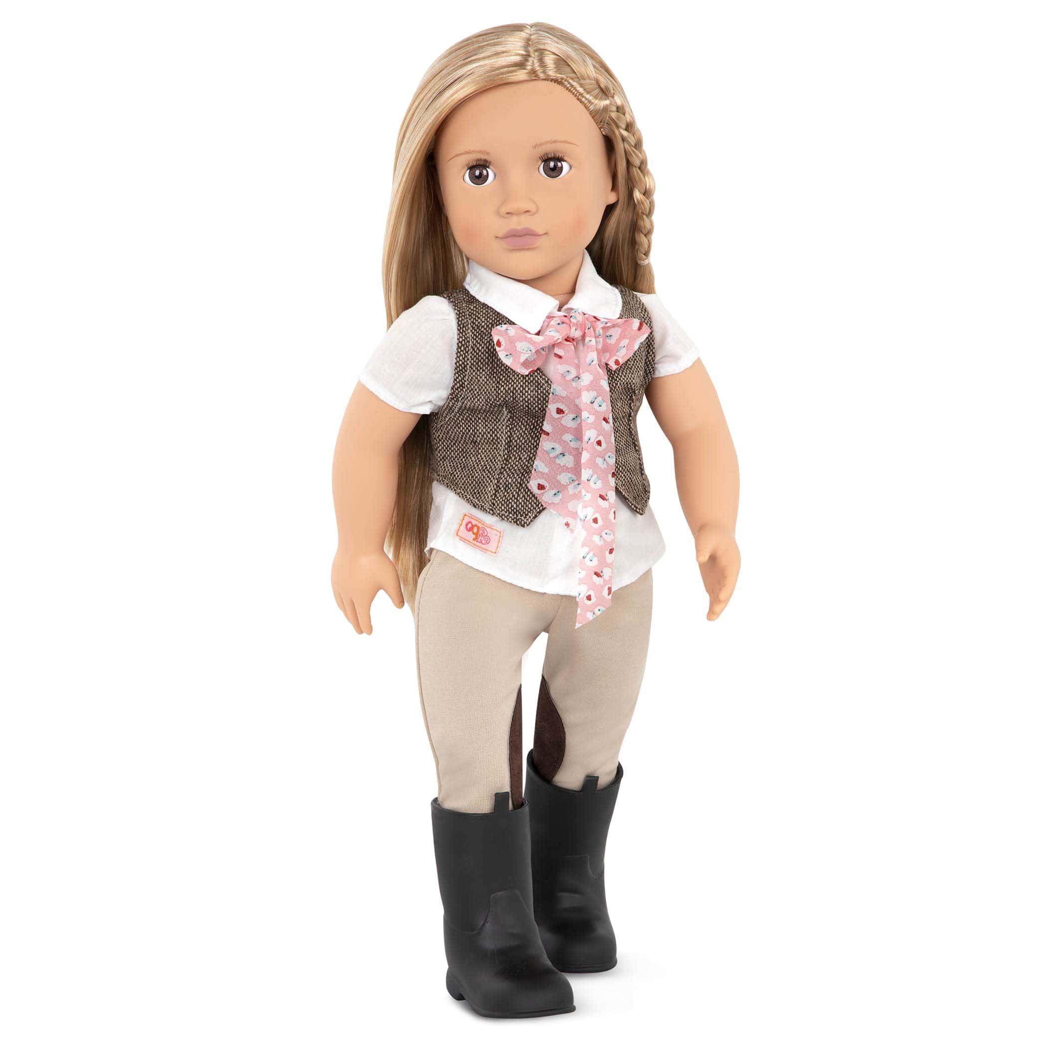 Rein or shine, ¡estamos galopando, trotando y saltando hacia la aventura! Blaze tu propio camino con nuestra muñeca de montar de 18 pulgadas Leah de Nuestra Generación. Esta encantadora muñeca de 18 pulgadas tiene unos bonitos ojos marrones y largos cabellos rubios rectos. Incluye; (1) chaleco, (1) par de pantalones de montar, (1) par de botas, (1) top, (1) pañuelo y (1) par de braguitas.