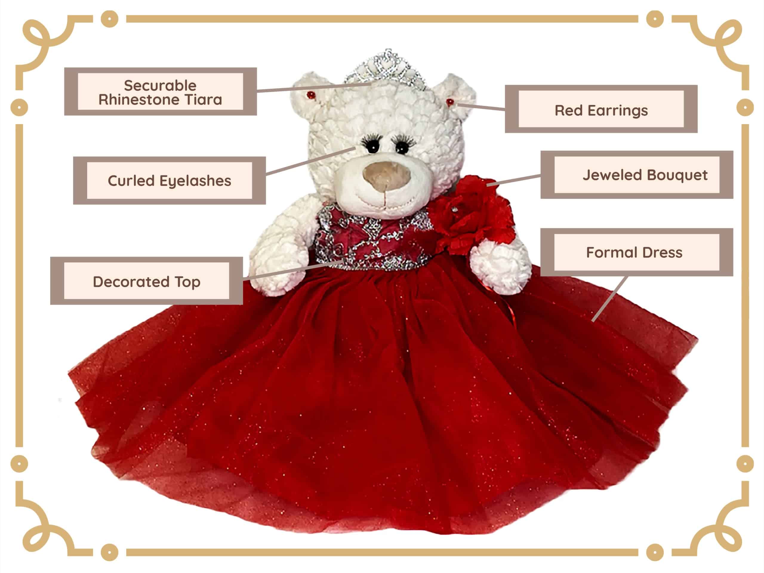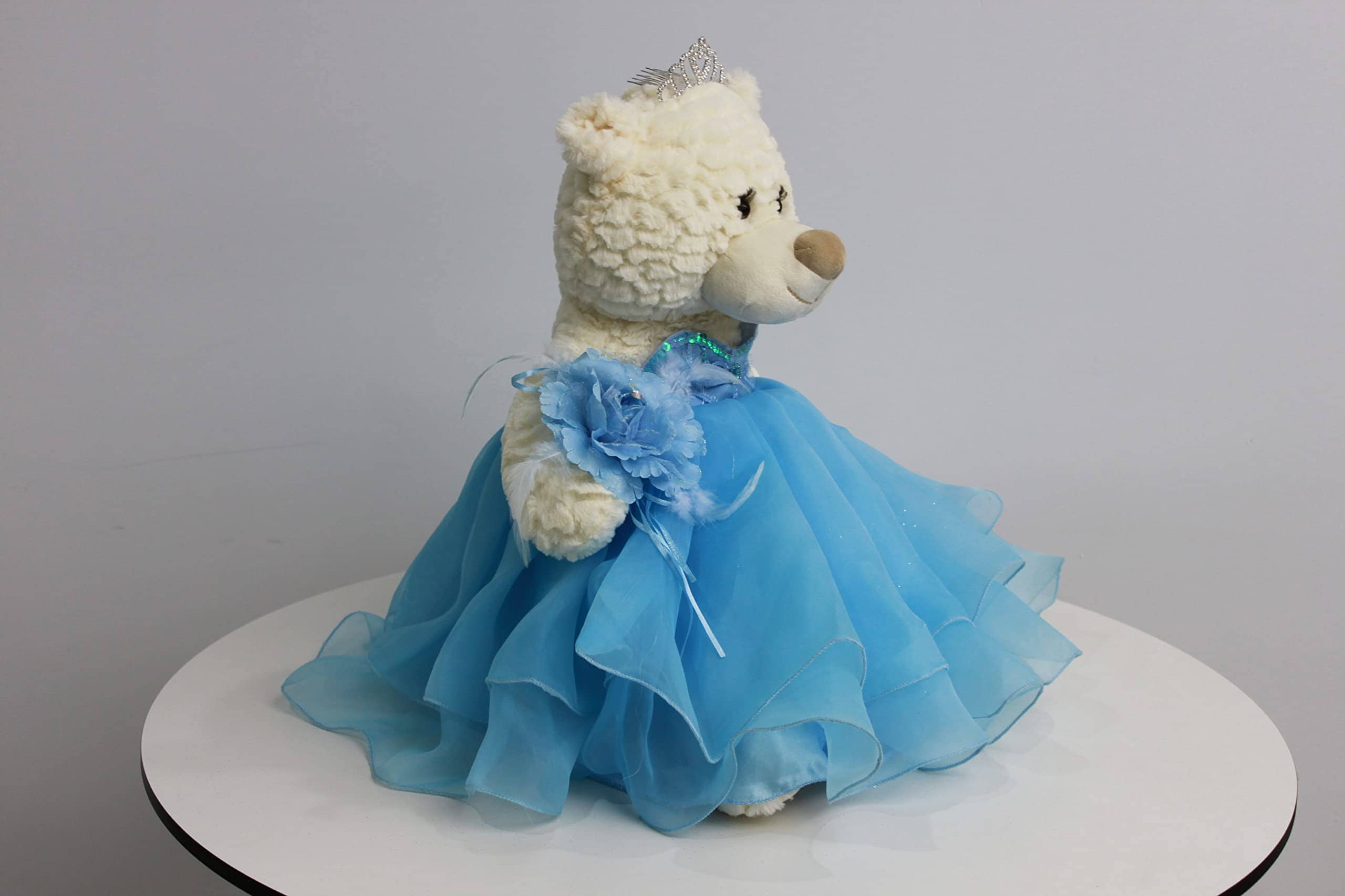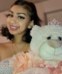 Para aquellos que buscan algo diferente a una muñeca, ahora tenemos la opción de ositos Quinceañera. Estos ositos miden 20″ de largo. De color crema, suaves y tiernos, vestidos con un elegante y glamoroso vestido. Únicos con pestañas largas y rizadas. El busto del vestido está decorado con lentejuelas y la falda está compuesta por 3 capas de tul y satén. La pierna derecha del osito está bordada con «Mis 15 Años». Completo y accesorizado con una pequeña tiara de pedrería, aretes, bouquet de muñeca a juego. Para mayores de 14 años.