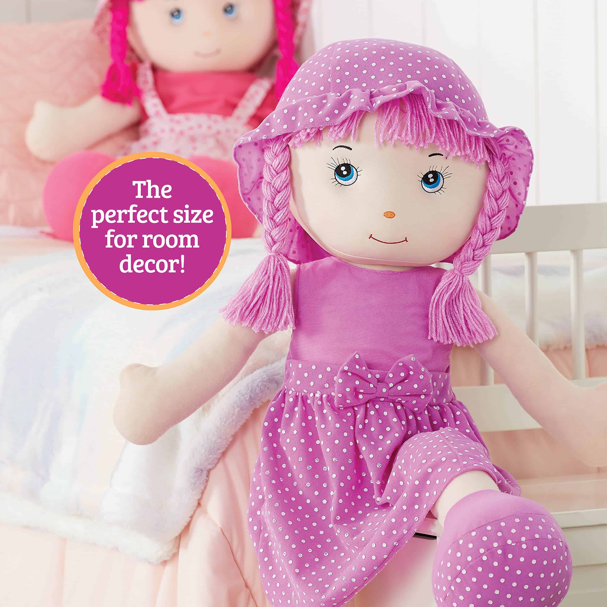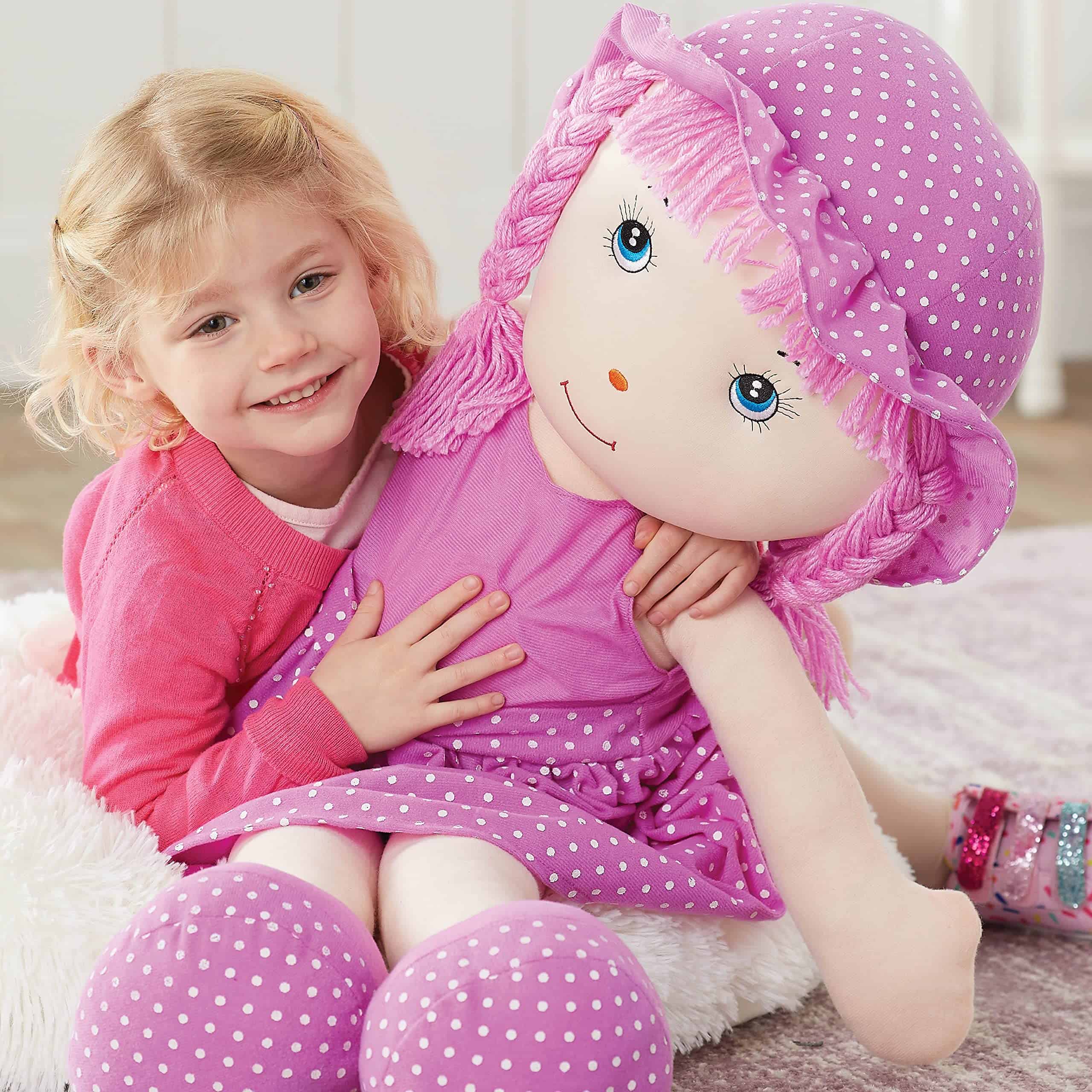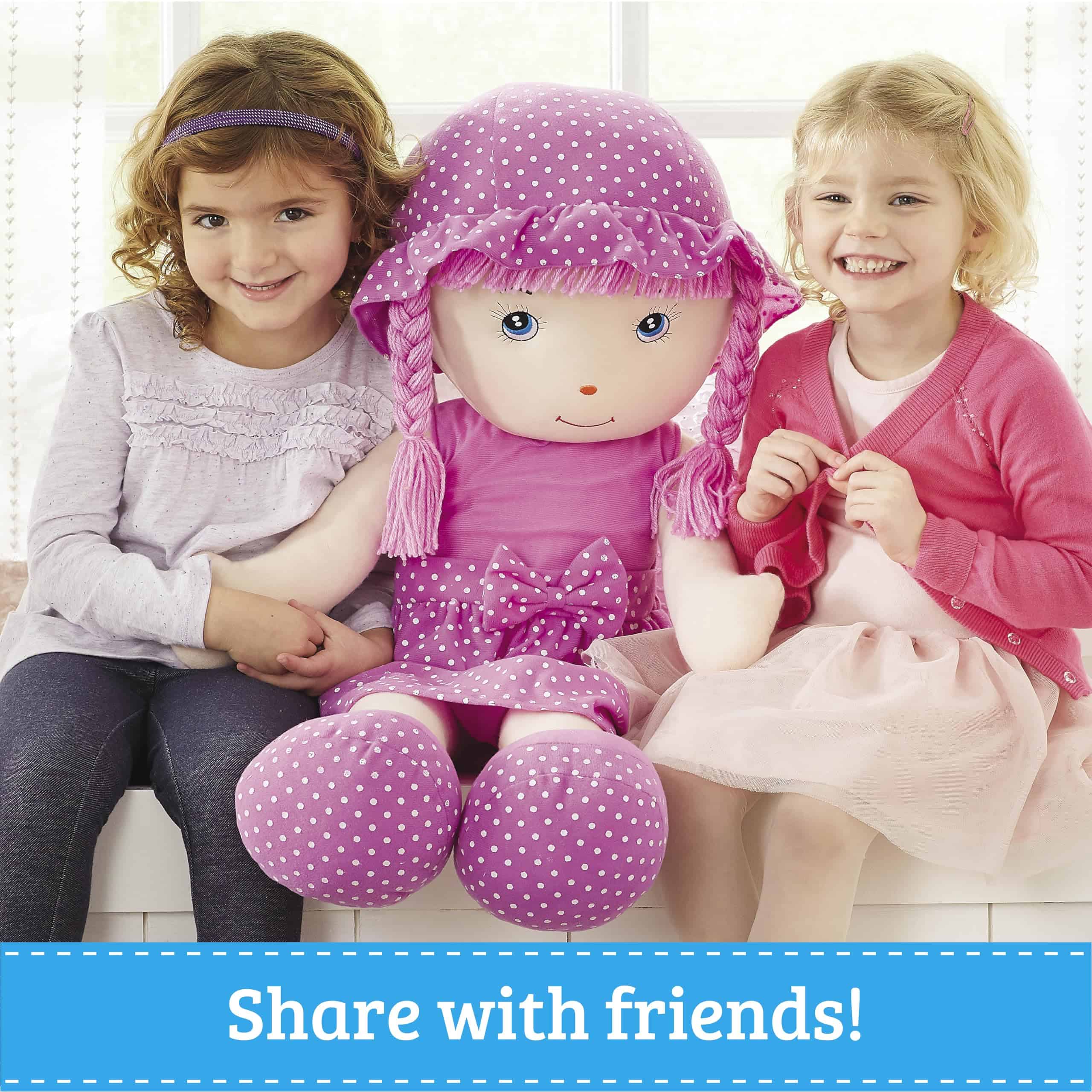 La línea de muñecas de trapo Love & Hug son las perfectas mejores amigas para que tus pequeños las sostengan y abracen. Estas adorables muñecas están cuidadosamente hechas con ropa de colores brillantes, cabello de lana suave y preciosas caras bordadas. Estas muñecas de peluche son el regalo perfecto para cualquier ocasión y son una gran adición a la decoración de la habitación de tu hijo. La muñeca mide 36 pulgadas de alto. Lavable a máquina. Recomendado para niños de 3 años en adelante.