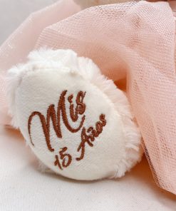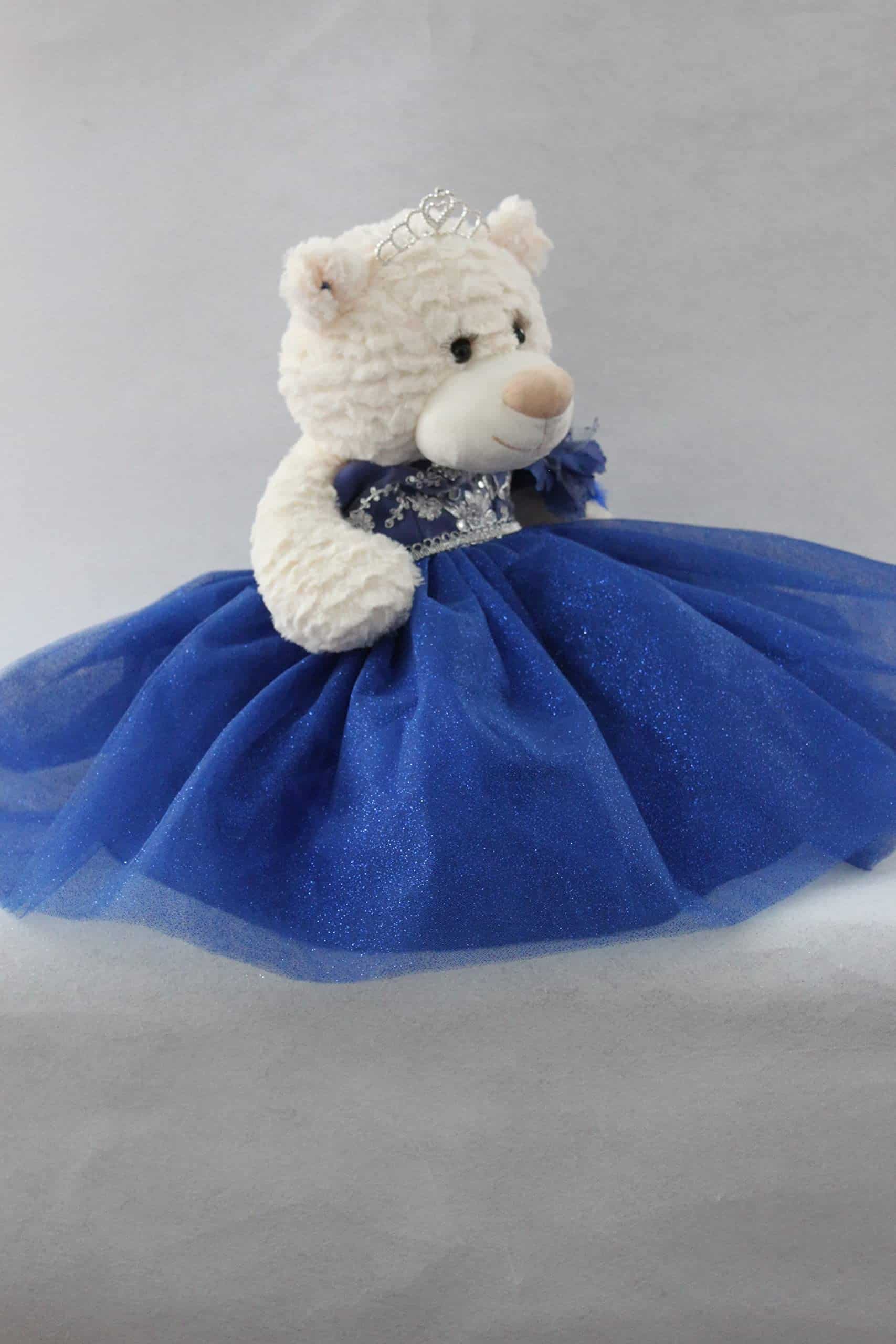 Para aquellos que buscan algo diferente a una muñeca, ahora tenemos la opción de Osos Quinceañeros. Estos osos miden 20″ de largo. De color crema, suaves y tiernos, vestidos con un elegante y glamuroso vestido. Únicos con largas pestañas rizadas. El busto del vestido está decorado con lentejuelas y la falda está compuesta por 3 capas de tul y satén. La pata derecha del oso está bordada con «Mis 15 Años». Completo y accesorizado con una pequeña tiara de diamantes de imitación, aretes, ramo de muñeca del mismo color. Para mayores de 14 años. Debido a diferentes monitores/calibraciones