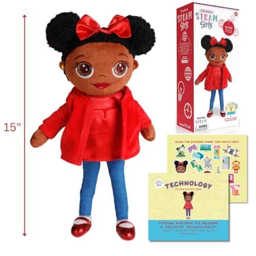¡Tyriqa la Tenaz Tecnóloga! 1. Muñeca de tela educativa y empoderadora de alta calidad. 2. Incluye libro de actividades de pegatinas de 8 páginas que ayuda a los niños a emocionarse por aprender sobre Tecnología! 3. Las Chicas Theodora S.T.E.A.M. son un conjunto de cinco muñecas cada una con un origen diverso. Silla, la científica americana asiática, Tyriqa, la tecnóloga afroamericana, Elaine, la ingeniera americana caucásica, Antonia, la artista americana latina, y Maalika, la matemática americana india. Juguetes perfectos para niñas de 3 años en adelante. ¡COLECCIÓNALAS TODAS!