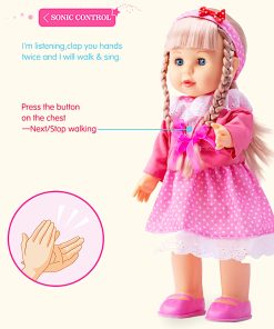 Muñeca caminante interactiva controlada por Sonic con trenza rubia; La muñeca cantará, hablará y caminará cuando aplaudas dos veces o presiones su pecho. Hermosos ojos azules parpadeantes con pestañas gruesas y largas; Tierna piel facial con tono de piel realista; Brazos y piernas de alta simulación. Cuerpo abrazable y ojos que se abren y cierran que fomentan sostenerla, cuidarla, un niño puede desarrollar habilidades sociales mientras se divierte en juegos de simulación. 17 pulgadas de alto, el tamaño perfecto para que niños de 3 a 7 años la abracen y la lleven. Requiere 3 pilas «AA» (no incluidas); Tapa de la batería en la espalda del bebé, a través de la ropa se puede tocar.
