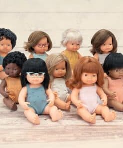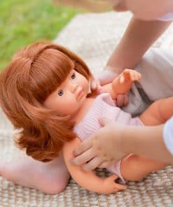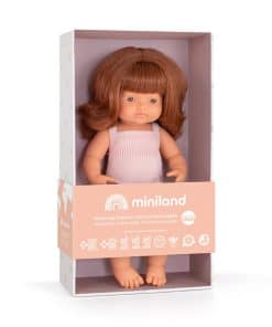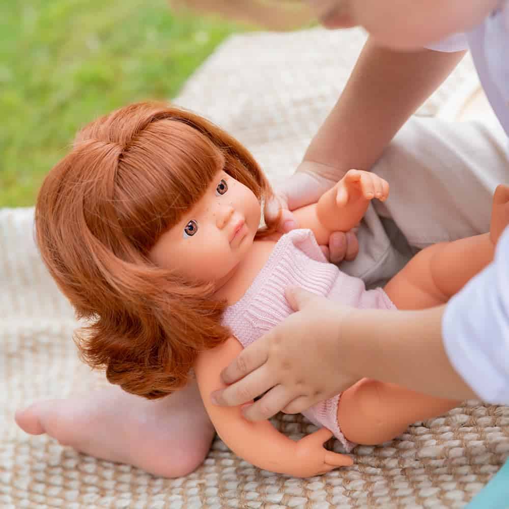 Muñeca Miniland con cabello rojo. Esta muñeca pertenece a la colección Edición Colorida de Miniland, que promueve valores de igualdad entre niños y niñas, independientemente de su origen, género o condición, y les permite tomar conciencia de la diversidad y desarrollar habilidades sociales como la empatía y la tolerancia.