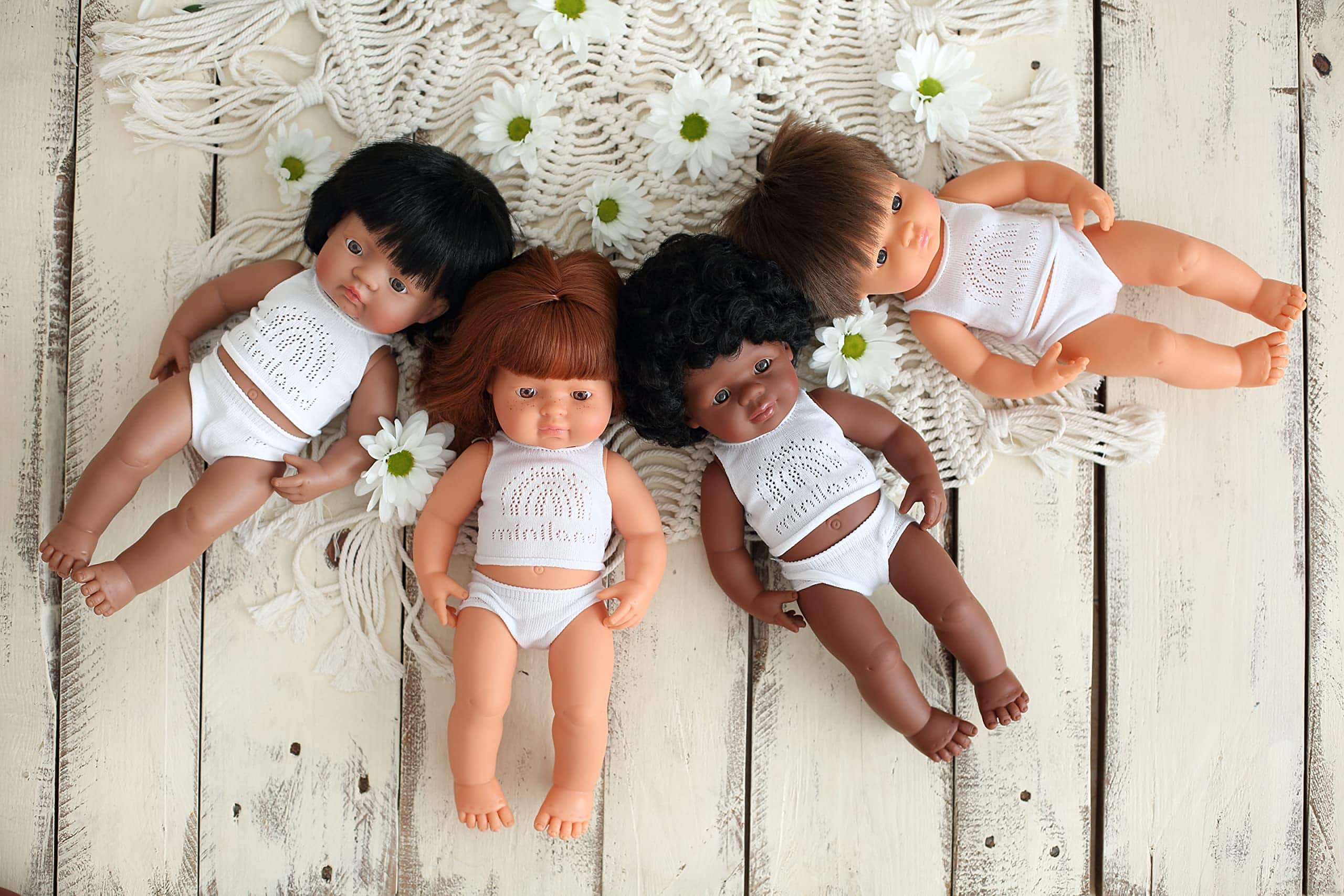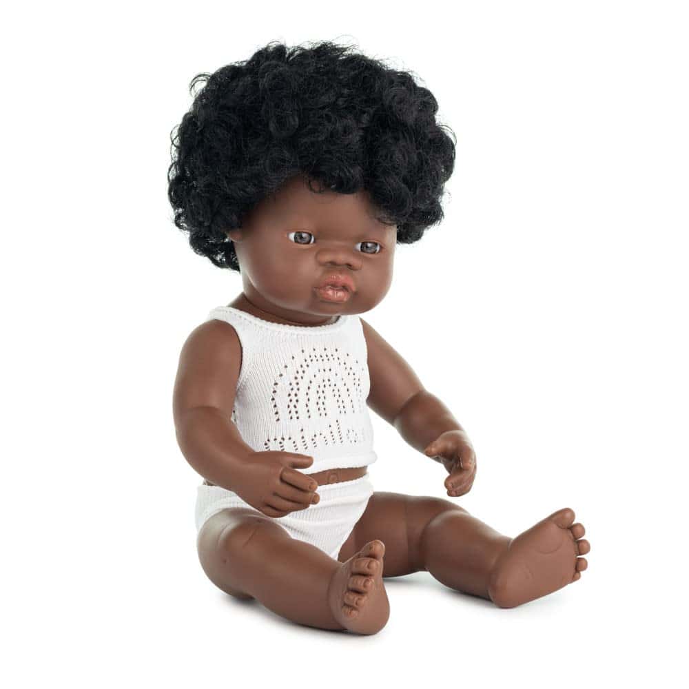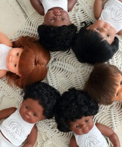 Muñecas vestidas con ropa interior y presentadas en una caja. Hechas de vinilo suave, extremadamente resistente y flexible. Cabeza, brazos y piernas articulados. Cuerpo hermético y perfumado. Pelo cosido. Facciones faciales muy bien definidas que ayudan a los niños a diferenciar entre razas. Ayudan a los niños a entender conceptos como familia, diversidad, convivencia.