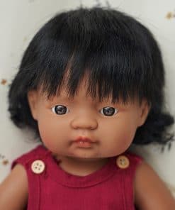 Muñecas vestidas con ropa interior y presentadas en una caja. Fabricadas en vinilo suave, extremadamente resistente y flexible. Cabeza, brazos y piernas articulados. Cuerpo hermético y perfumado. Pelo cosido. Rasgos faciales muy definidos que ayudan a los niños a diferenciar entre razas. Ayudan a los niños a comprender conceptos como familia, diversidad, convivencia.