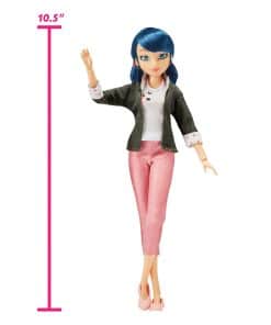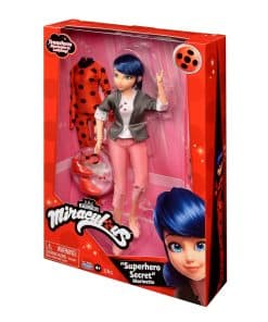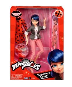 Las muñecas y accesorios Miraculous Ladybug Superhero Secret crean un mundo de imaginación en el que los niños pueden ‘Ser Valientes, Ser Fuertes, Ser Milagrosos’. Marinette Dupain-Cheng parece ser una adolescente normal, que aspira a ser diseñadora de moda y está muy centrada en lo chic y en el estilo parisino. Pero hay algo sobre ella que aún nadie sabe; ¿es su identidad secreta como la superhéroe que lucha contra el crimen, Ladybug? ¿O su secreto crush en Adrien Agreste (también conocido como Cat Noir)? Sea cual sea, Marinette está lista para la prueba cuando las cosas van mal y ella cree en el poder del amor. ¡Ahora puedes crear tus propias aventuras de Ladybug con esta muñeca Marinette Superhero Secret de 10.5 pulgadas que incluye dos conjuntos de moda completos, para transformar a Marinette en Ladybug! Incluye el atuendo diurno de Marinette con pantalones capri rosas, saco gris con detalles de lunares, camiseta con estampado de flores de cerezo, aretes y adorables zapatos rosas. También viene con el traje de superhéroe rojo y negro característico de Ladybug, botines rojos, aretes y máscara facial. ¡Intercambia cada parte de sus atuendos y accesorios para contar historias de superhéroes súper emocionantes! Con 13 puntos de articulación, la muñeca está lista para una pose llena de acción. Basado en la popular serie animada de televisión, ¡colecciona todas las muñecas Superhero Secret de Playmates Toys!