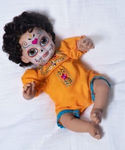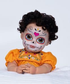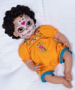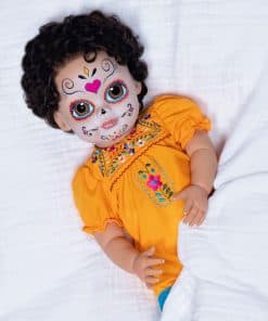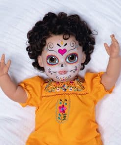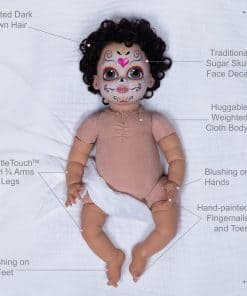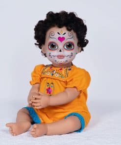 Paradise Galleries Azuquita conmemora la festiva tradición del Día de Los Muertos, que es muy celebrada en México y América Latina. Esta celebración única es un momento de recuerdo donde las familias rinden homenaje con oraciones, ofrendas de comida, y crean altares decorados con velas y cempasúchil para los seres queridos fallecidos. Durante los días y noches de Día de Los Muertos, las familias usan máscaras de calaveras o pintan sus caras como calaveras en colores vibrantes. Nuestra encantadora muñeca realista de niña lleva un maquillaje facial tradicional llamado La Calavera Catrina, o la elegante calavera, con ojos pintados a mano diseñados por la artista de muñecas renacidas Mayra Garza con sede en México. Vistiendo un mono amarillo con bordado floral, mangas abullonadas y encaje azul alrededor de las aberturas de las piernas, el conjunto de Azuquita honra las costumbres, símbolos y rituales a menudo vistos durante este día festivo. Fabricada en Vinilo GentleTouch para una sensación suave y realista, el material de Vinilo GentleTouch de la muñeca imita la suavidad y textura de la piel real, proporcionando una sensación realista y suave que mejora la calidad general y la experiencia, perfecta para coleccionistas y aficionados a las muñecas. La muñeca Paradise Galleries promete su 100% de satisfacción, estamos seguros de que quedará encantado con su compra. Desde 1991, Paradise Galleries ha sido líder en llevar la magia de muñecas galardonadas a coleccionistas de todo el mundo, dedicados a ofrecerte los tesoros artísticos más irresistibles e innovadores de los artistas y diseñadores de primer nivel del mundo.