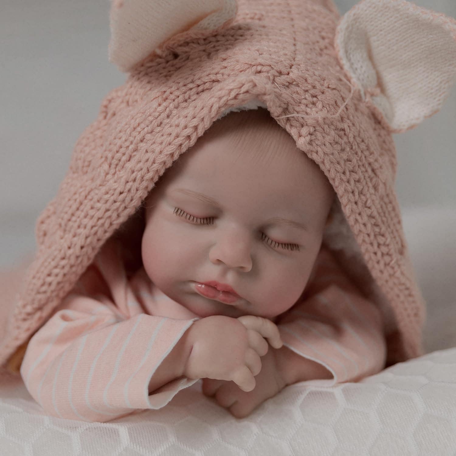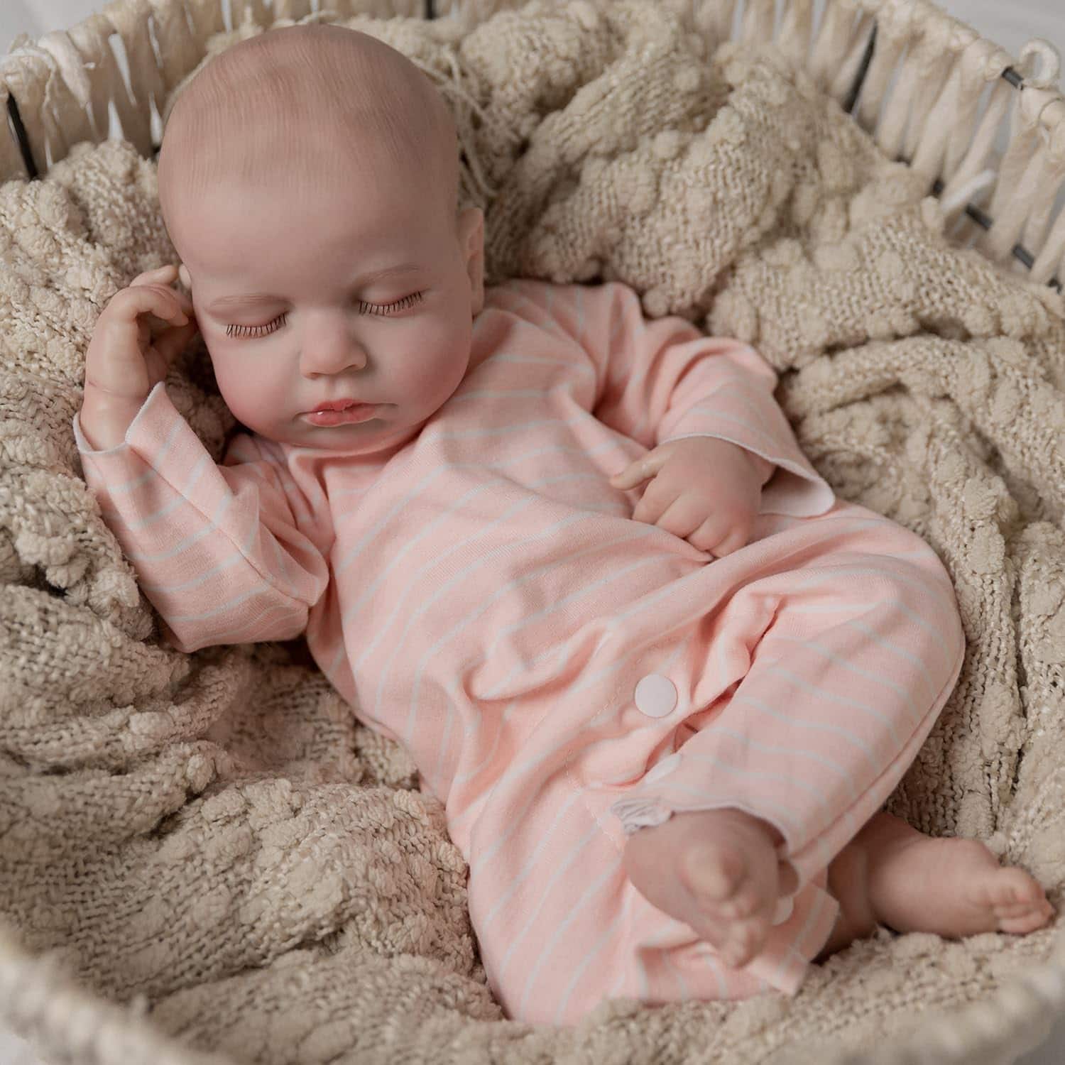 3. Diseño detallado: La muñeca realista tiene una cara adorable con cejas pintadas a mano. Sus pestañas están enraizadas una por una a mano. Hay venas claramente visibles en su cabeza, brazos y piernas.